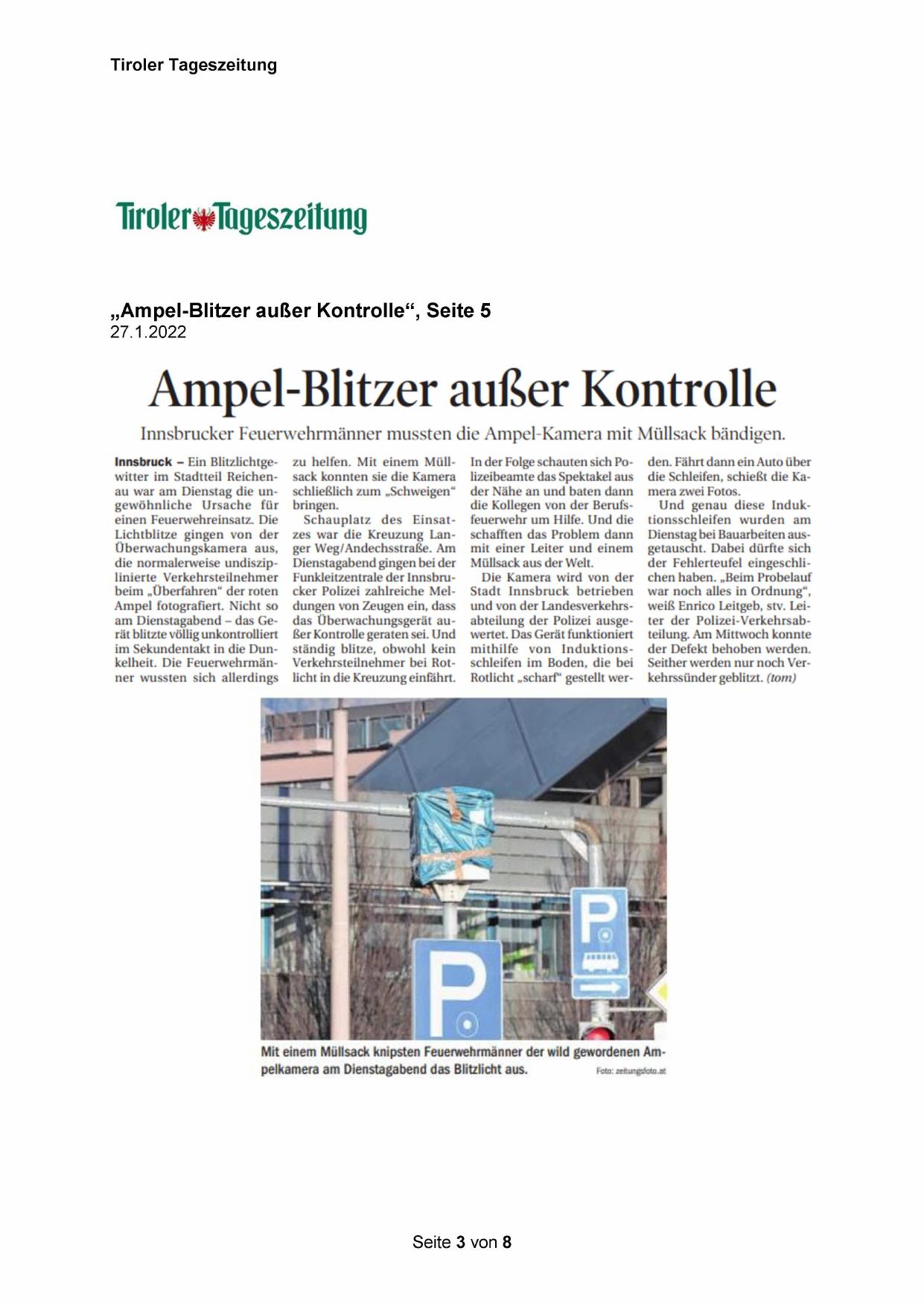 Innsbrucker Feuerwehrmänner mussten die Ampel-Kamera mit Müllsack bändigen.