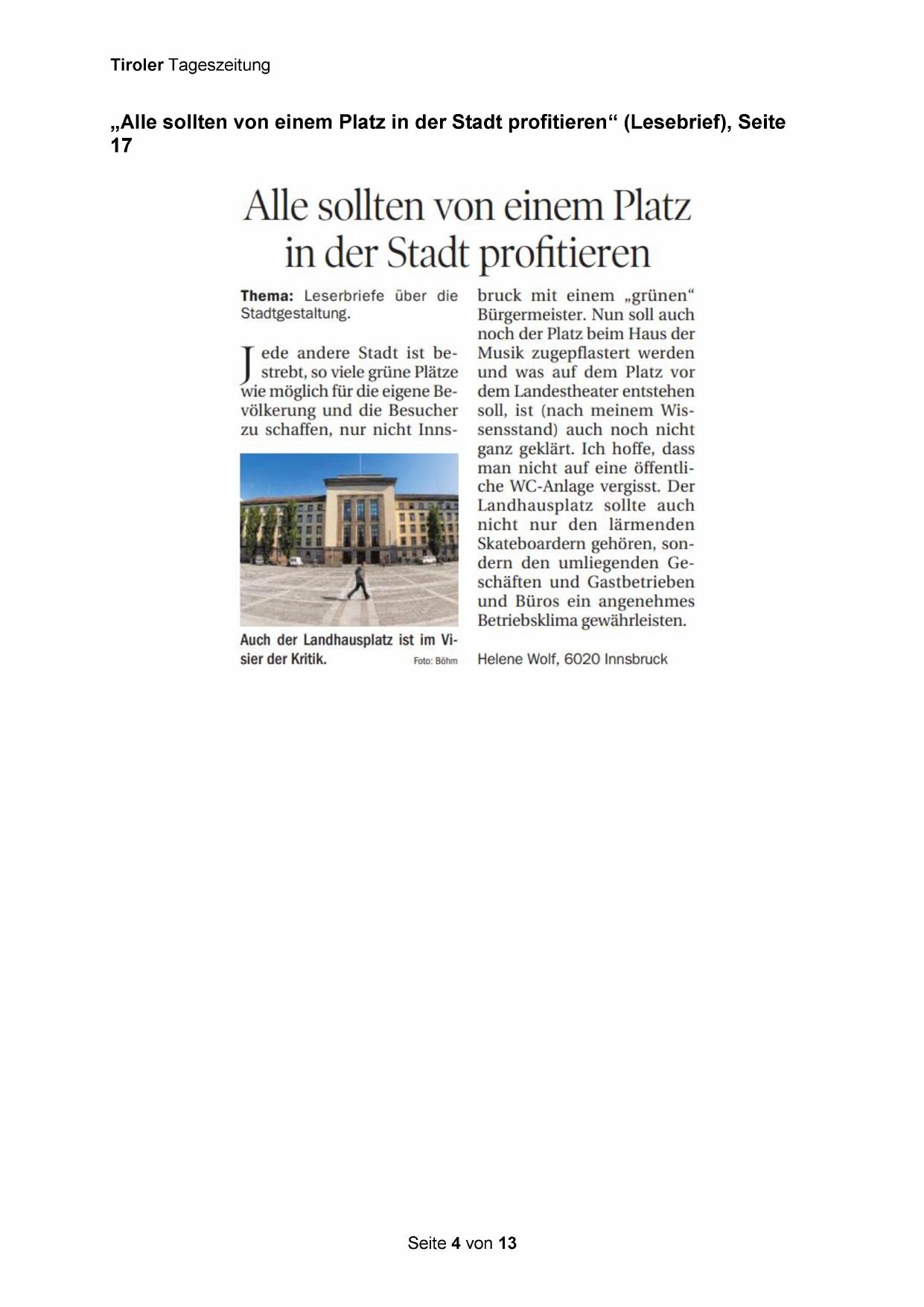 „Alle sollten von einem Platz in der Stadt profitieren“ (Lesebrief), Seite