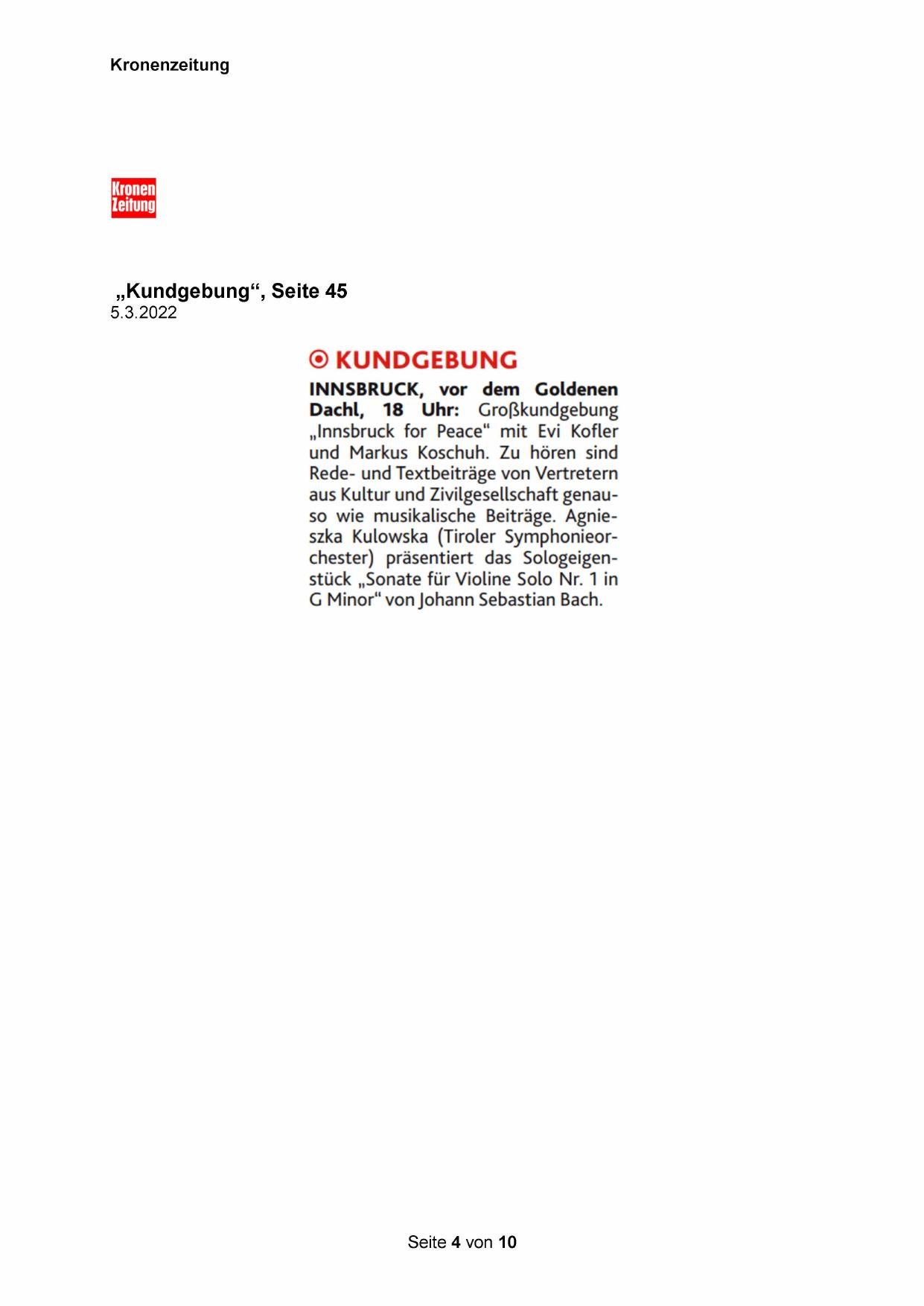 aus Kultur und Zivilgesellschaft genauso wie musikalische Beiträge. Agnieszka Kulowska (Tiroler Symphonieorchester) präsentiert das Sologeigenstück „Sonate für Violine Solo Nr. 1 in