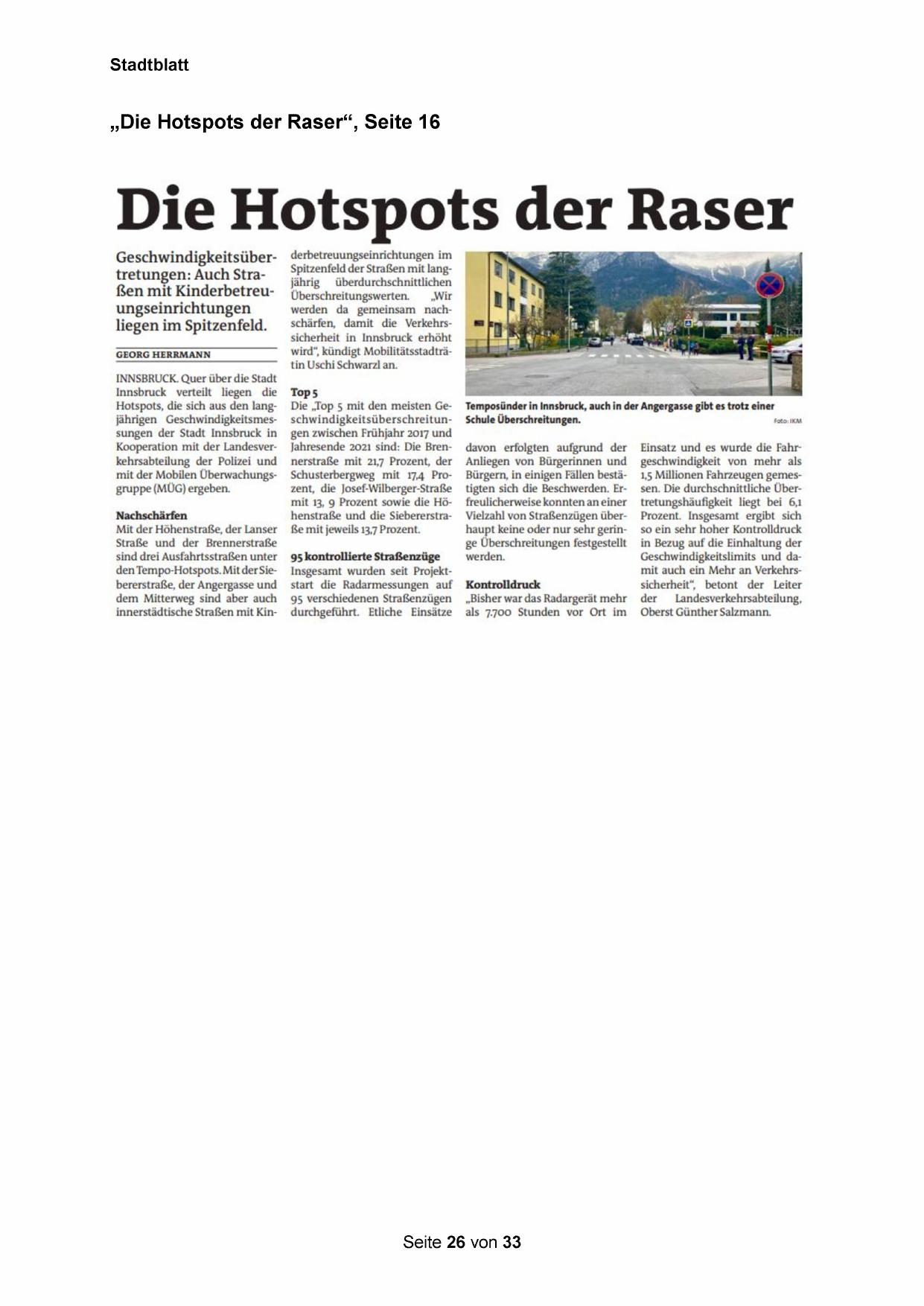 Hotspots, die sich aus den langjährigen Geschwindigkeitsmessungen der Stadt Innsbruck in