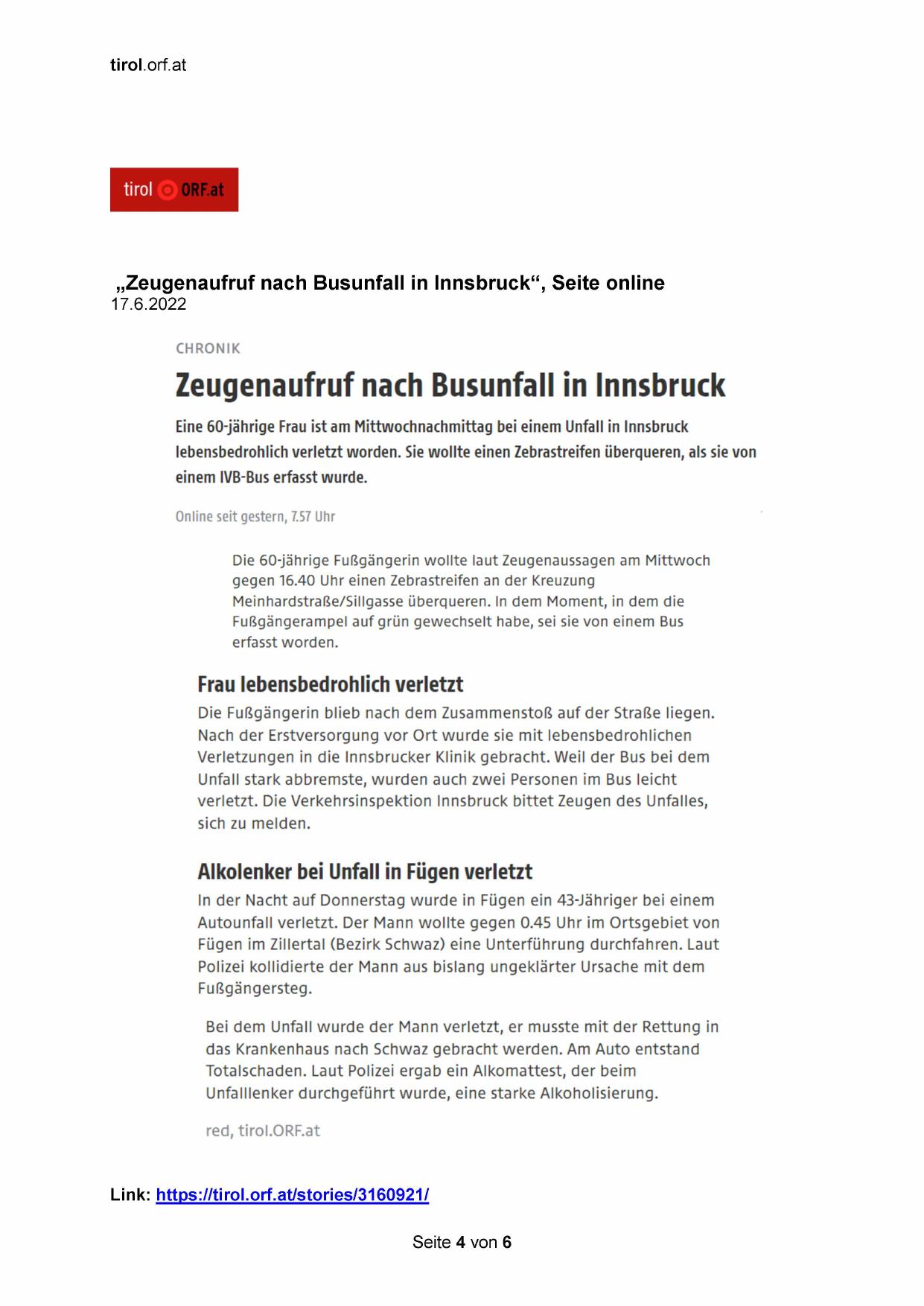 „Zeugenaufruf nach Busunfall in Innsbruck“, Seite online