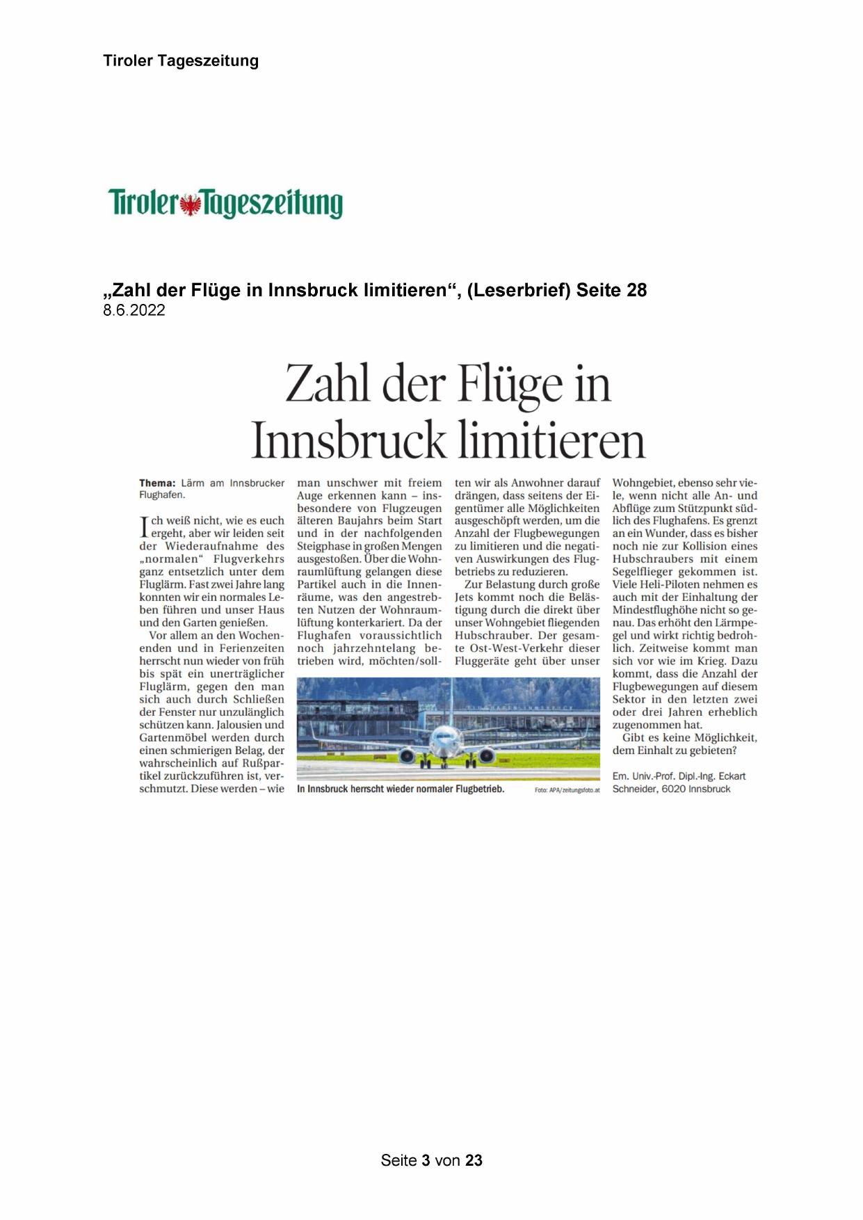 „Zahl der Flüge in Innsbruck limitieren“, (Leserbrief) Seite 28