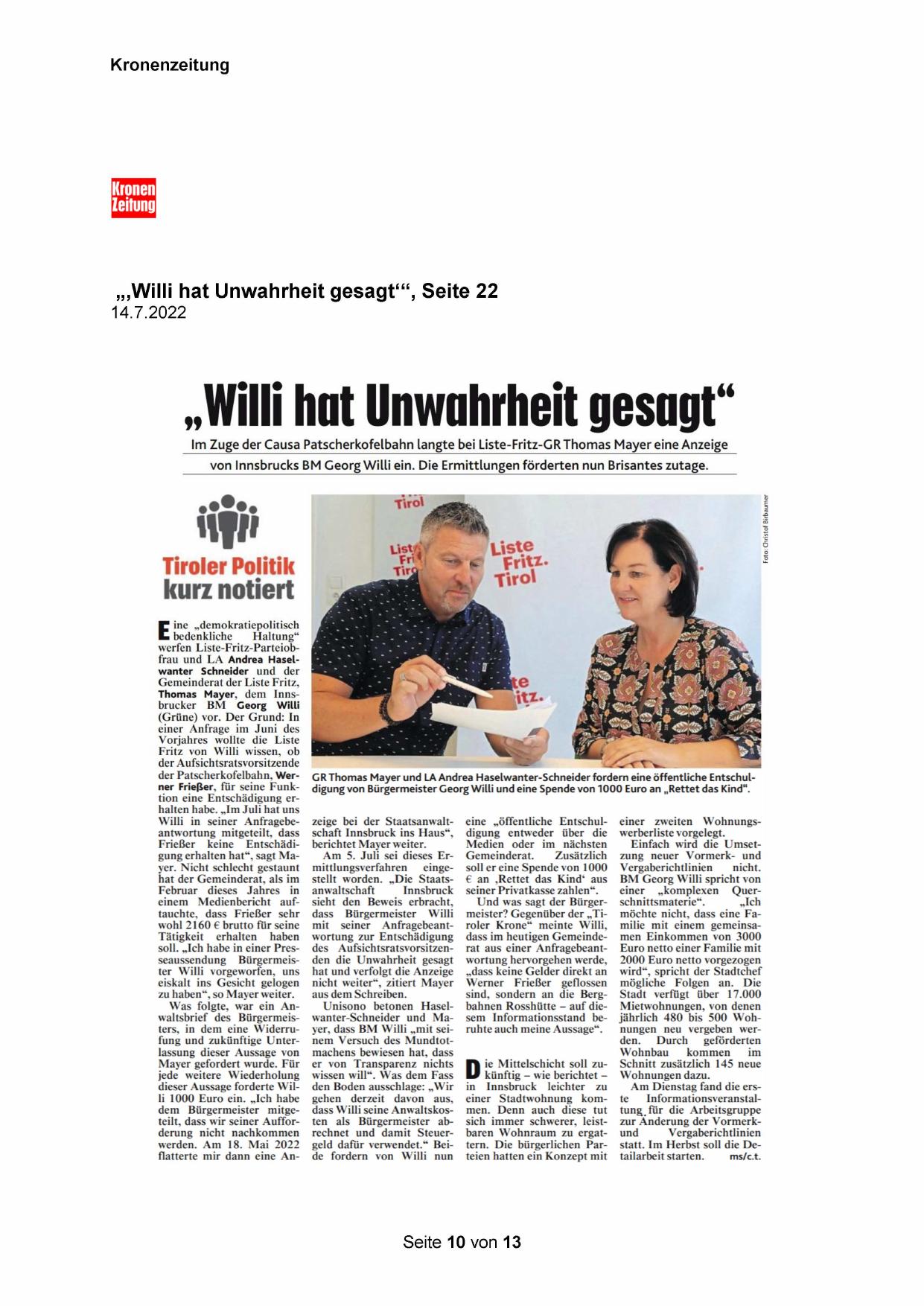 Und was sagt der Bürgermeister? Gegenüber der „Tiroler Krone“ meinte Willi,