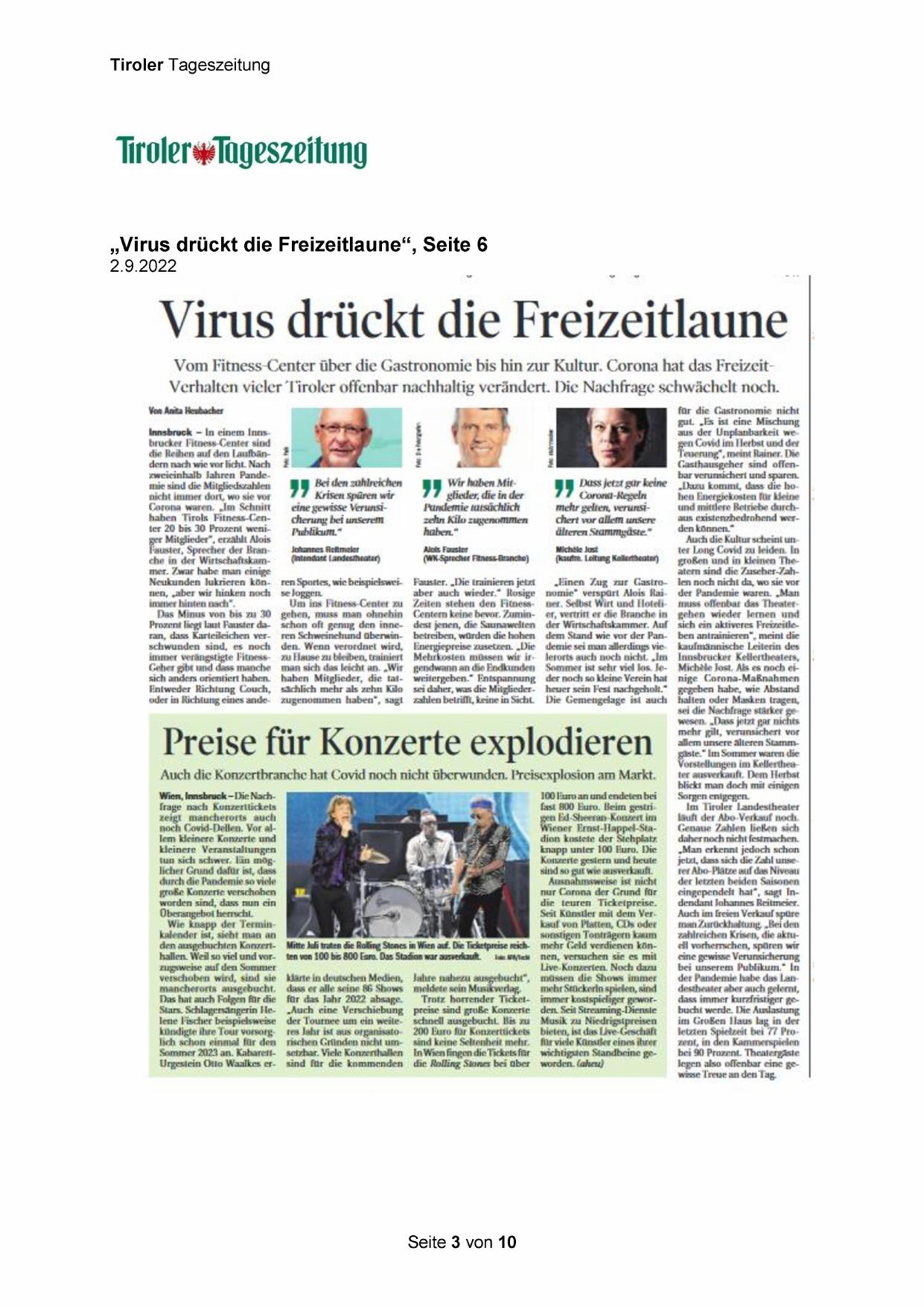Corona waren. „Im Schnitt enngnm1.n Mkl!lelllfliih:ll Mrglnm. verluäreSt- und mittlere Betriebe durchhaben Tirols Fitness-Cen- — Cherung bei unserem zehin Kilo zugenommen Chert vor allem unsere aus existenzhedrahend werter 20 bis 20 Prozemt weni- Publikum.“ haben.“ älteren Stammyäste.“ den können.“