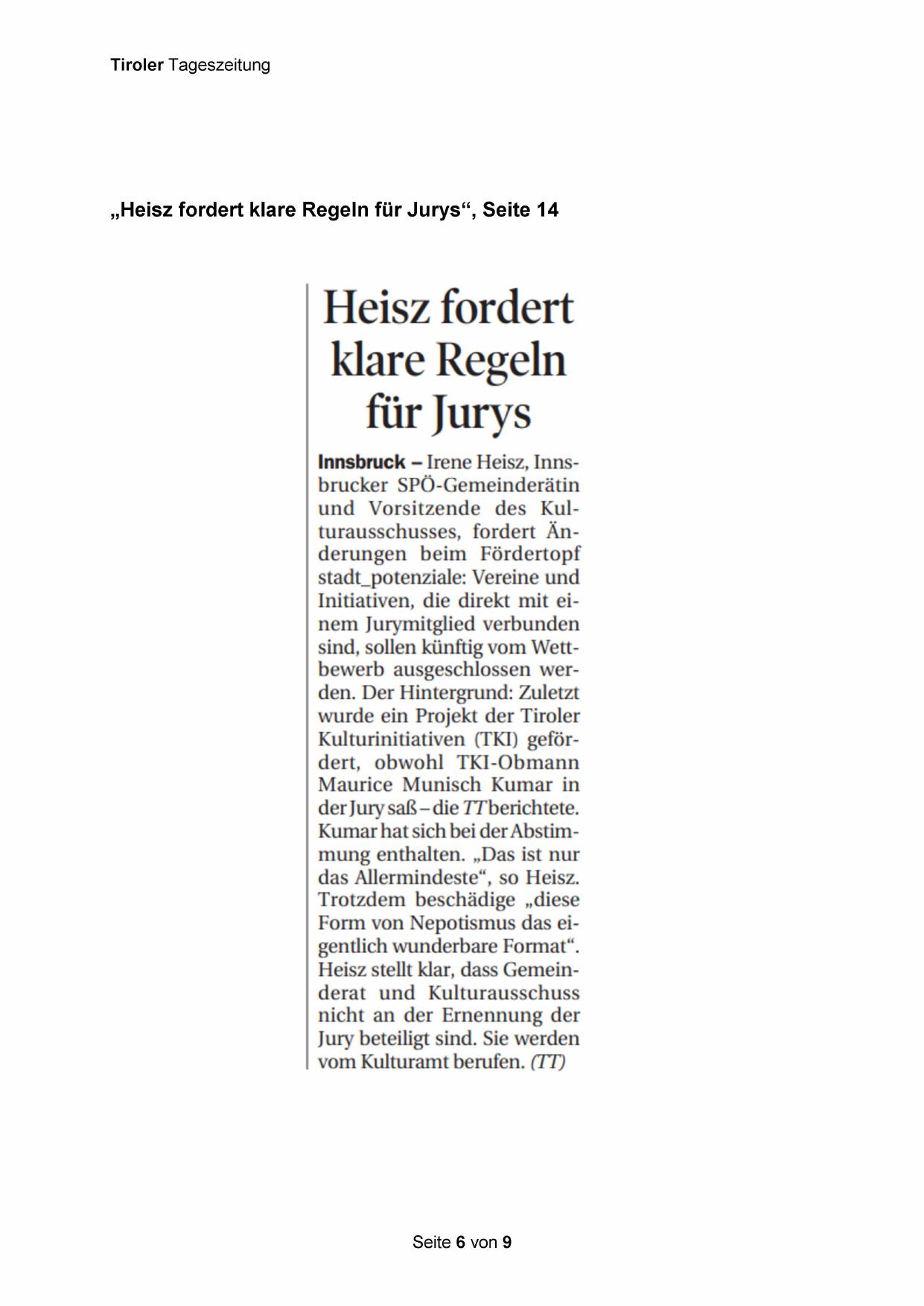 „Heisz fordert klare Regeln für Jurys“, Seite 14