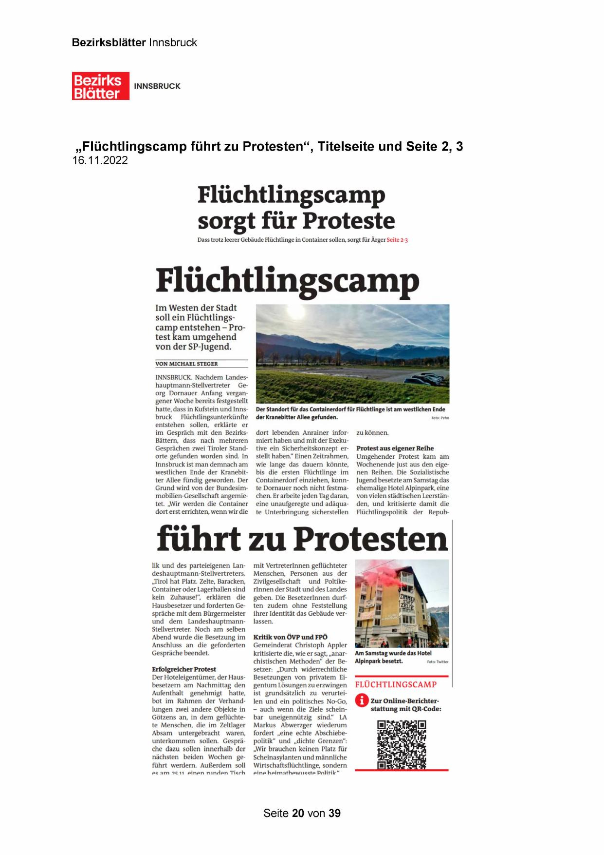 „Flüchtlingscamp führt zu Protesten“, Titelseite und Seite 2, 3