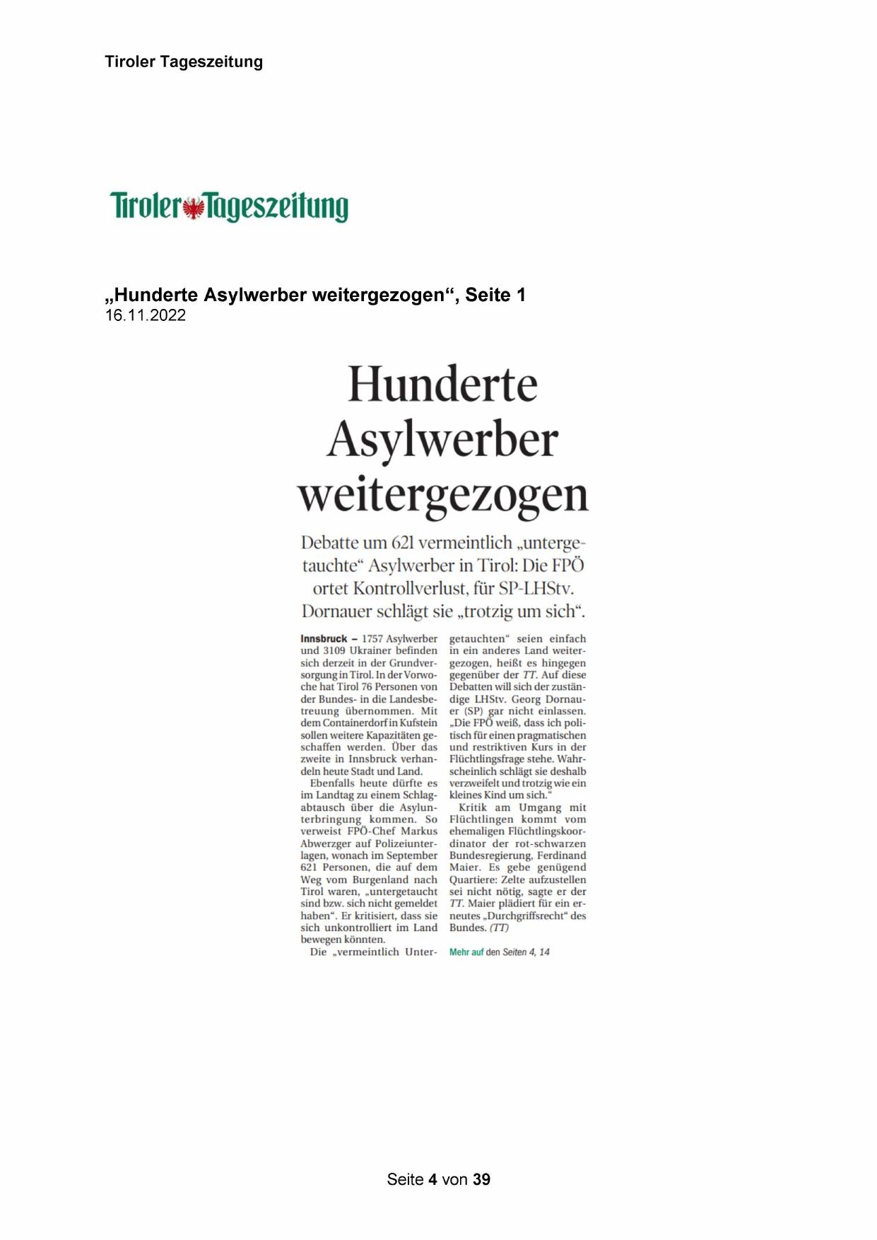 „Hunderte Asylwerber weitergezogen“, Seite 1