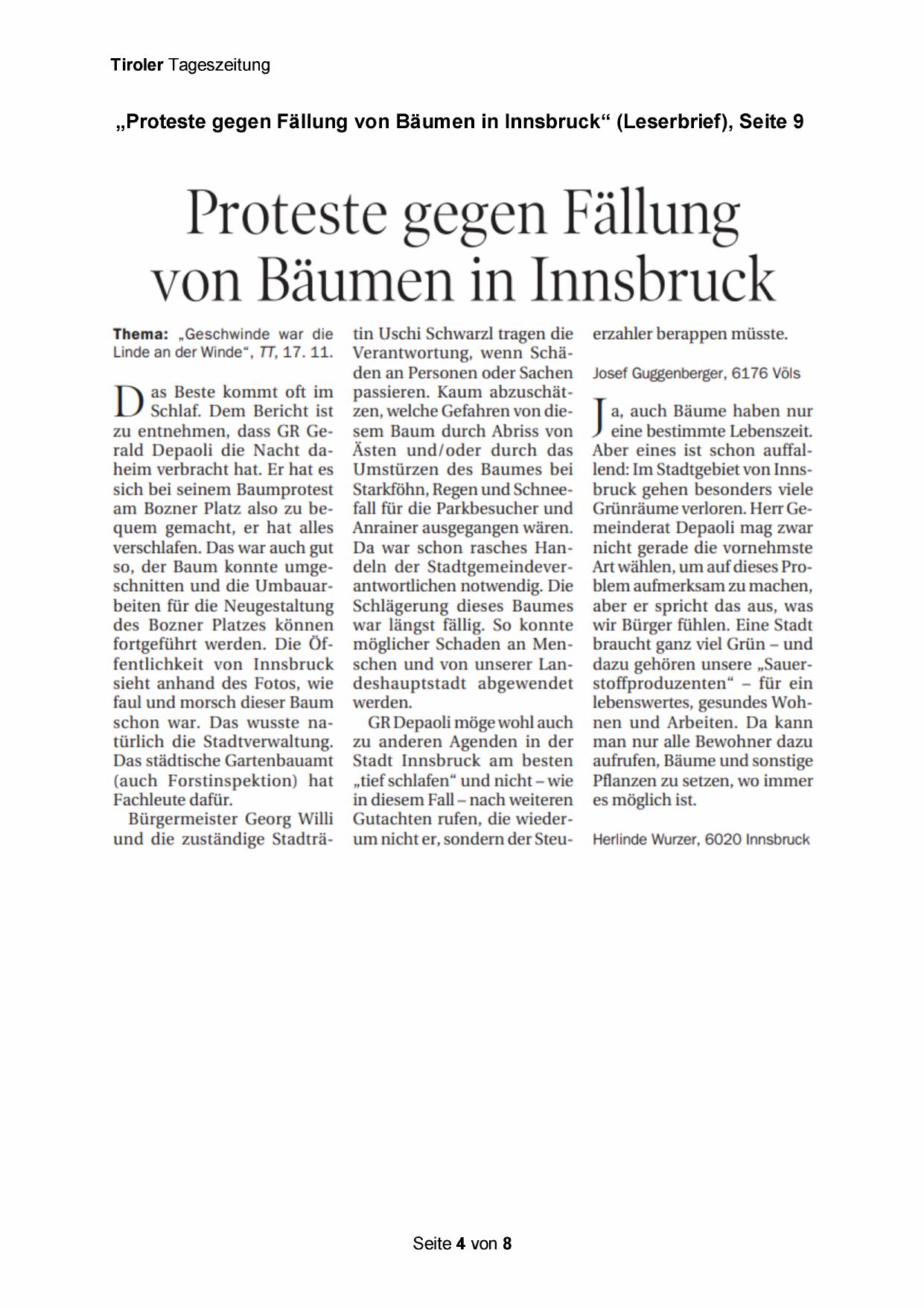 „Proteste gegen Fällung von Bäumen in Innsbruck“ (Leserbrief), Seite 9