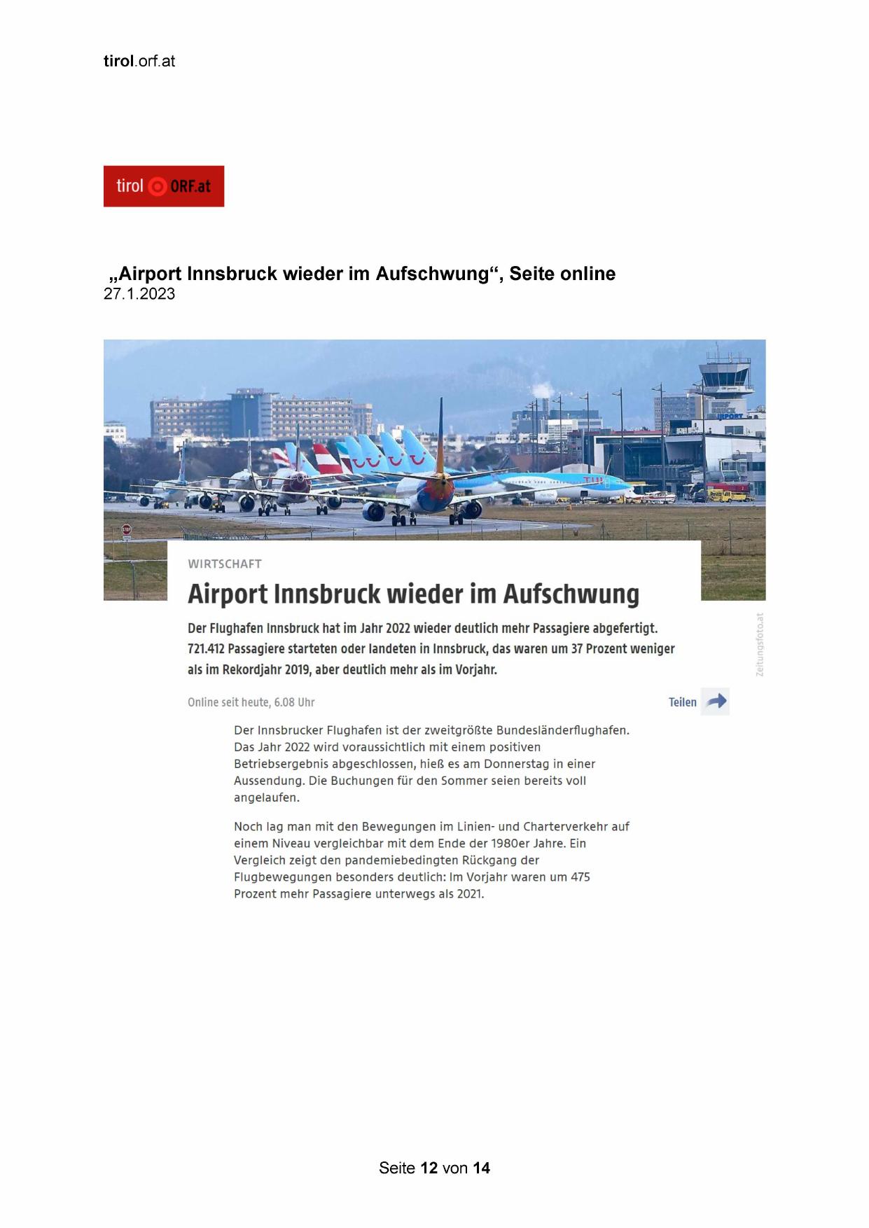 „Airport Innsbruck wieder im Aufschwung“, Seite online