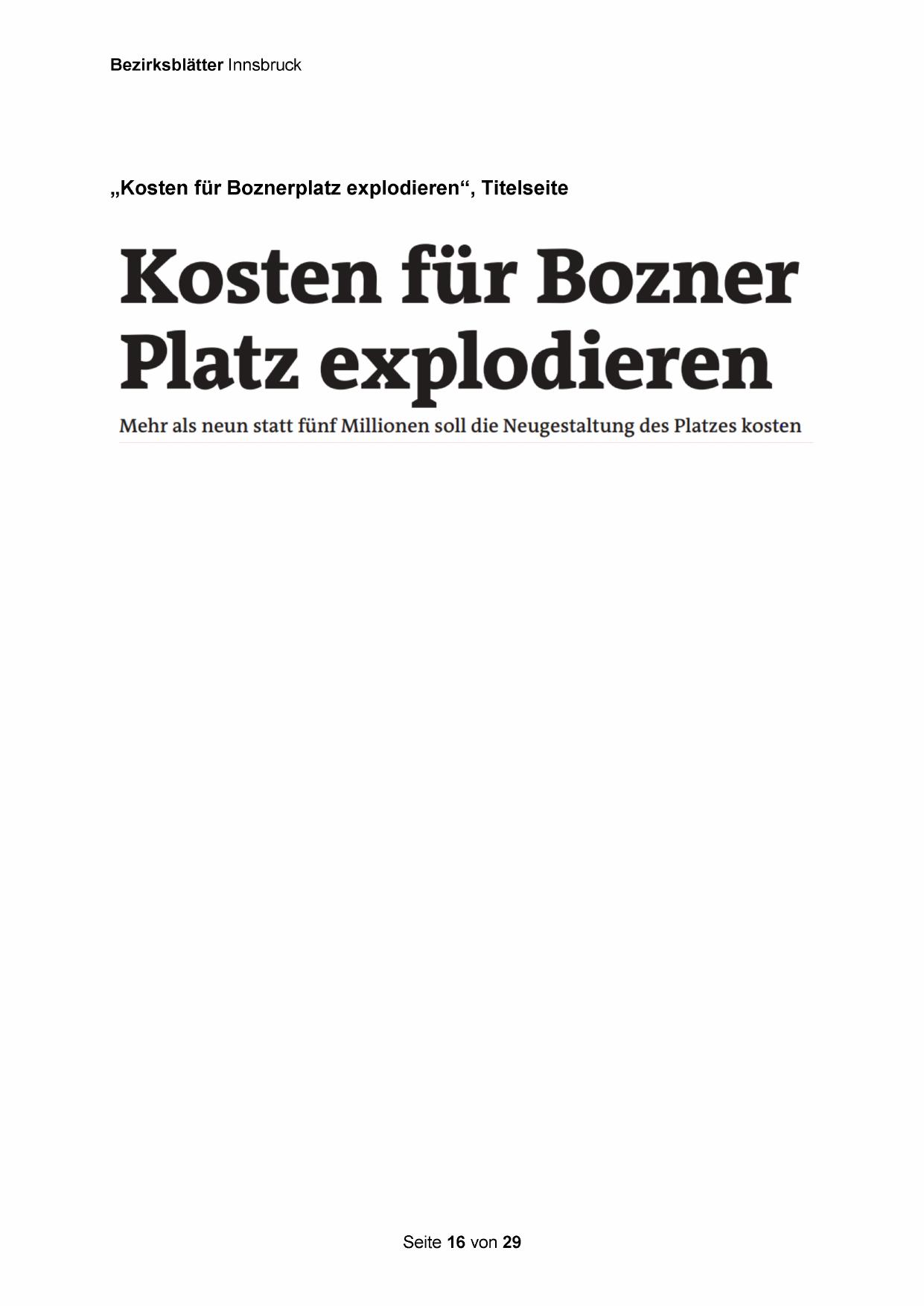 „Kosten für Boznerplatz explodieren“, Titelseite