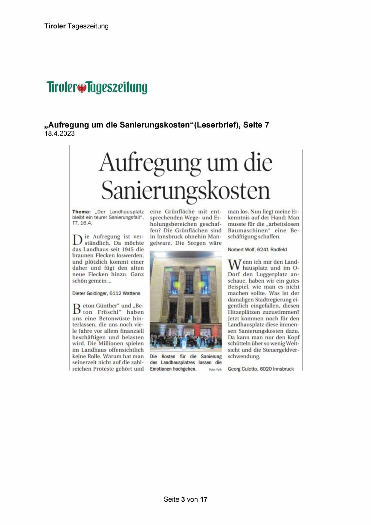 „Aufregung um die Sanierungskosten“(Leserbrief), Seite 7