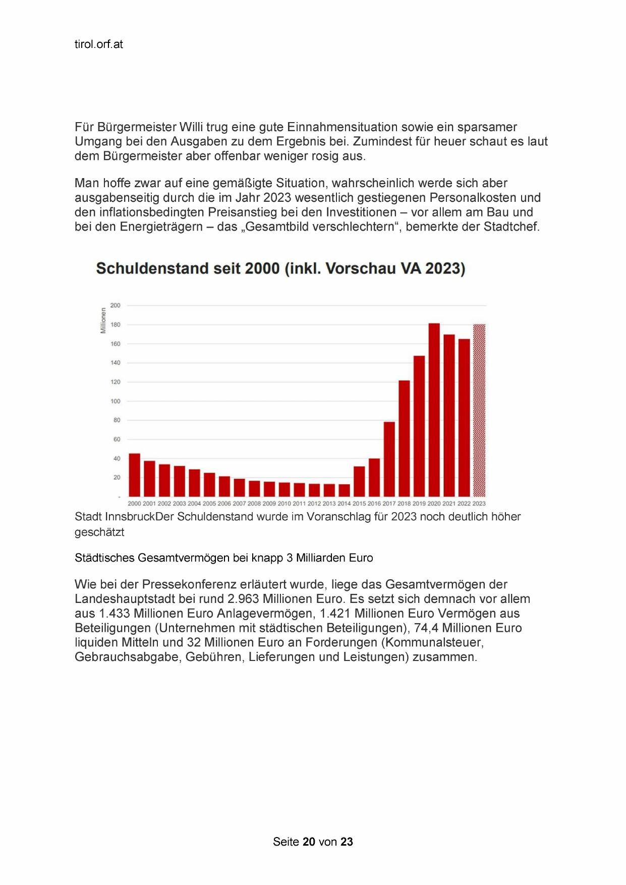 Stadt InnsbruckDer Schuldenstand wurde im Voranschlag für 2023 noch deutlich höher