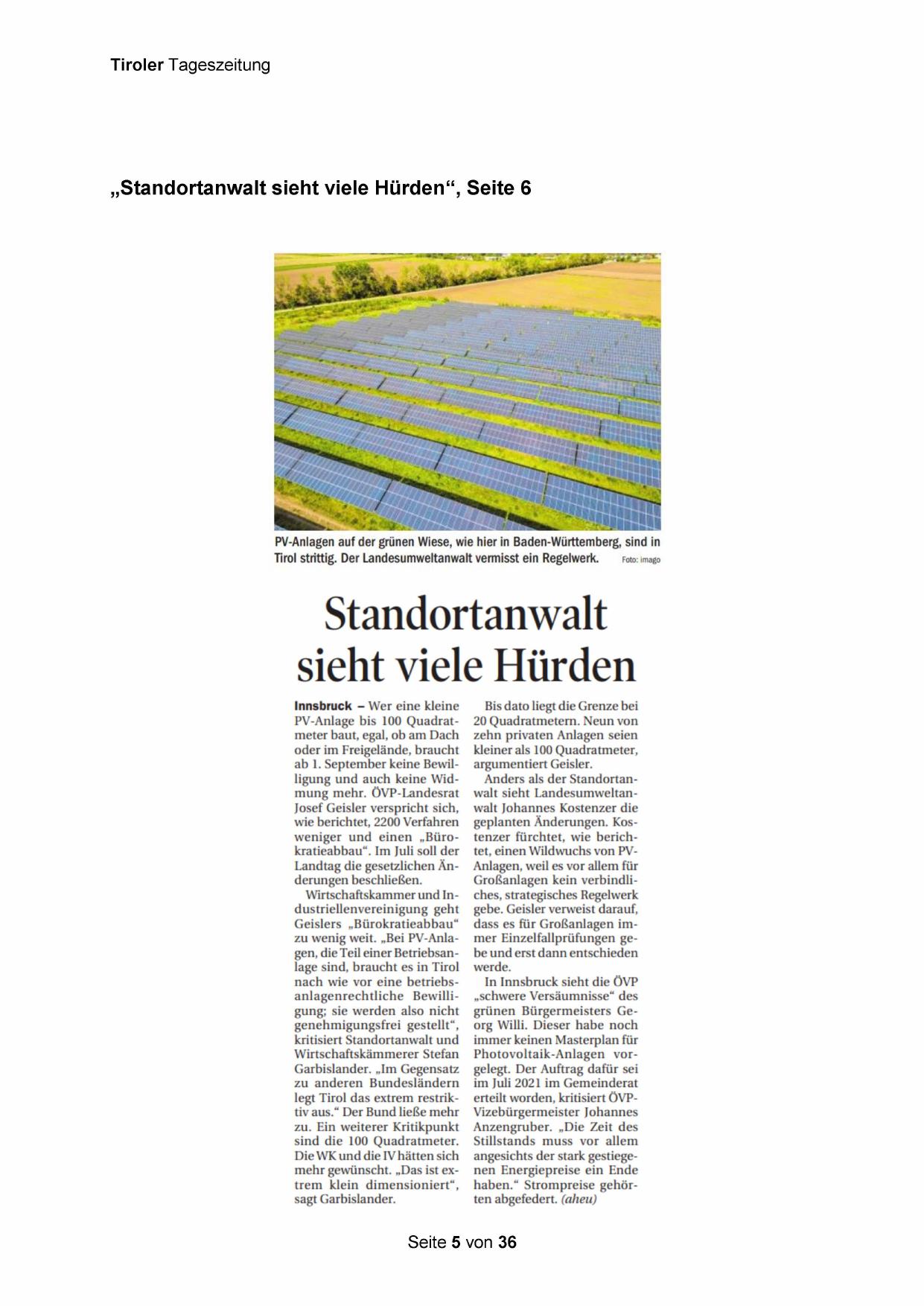 geplanten Änderungen. Kostenzer fürchtet, wie berichtet, einen Wildwuchs von PV-