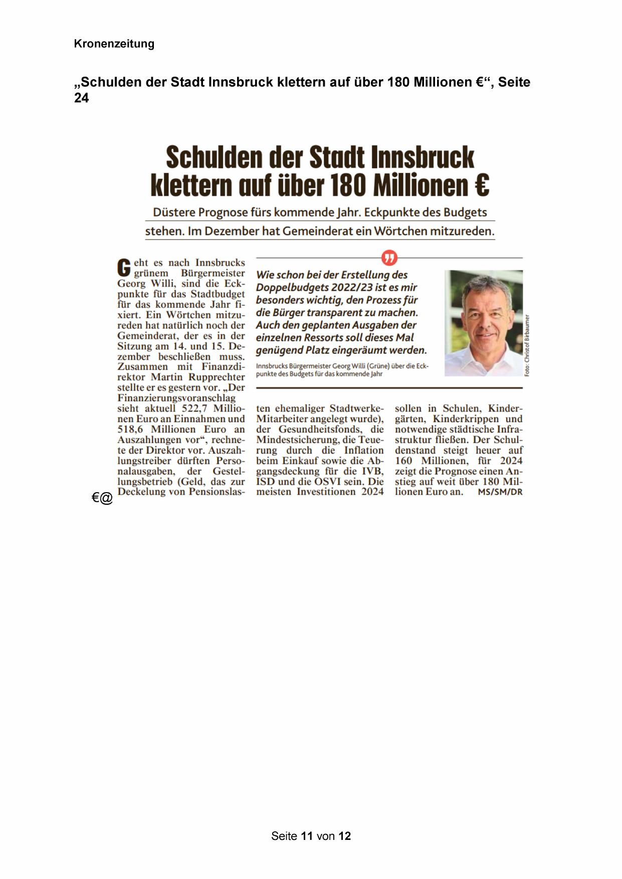 „Schulden der Stadt Innsbruck klettern auf über 180 Millionen €“, Seite