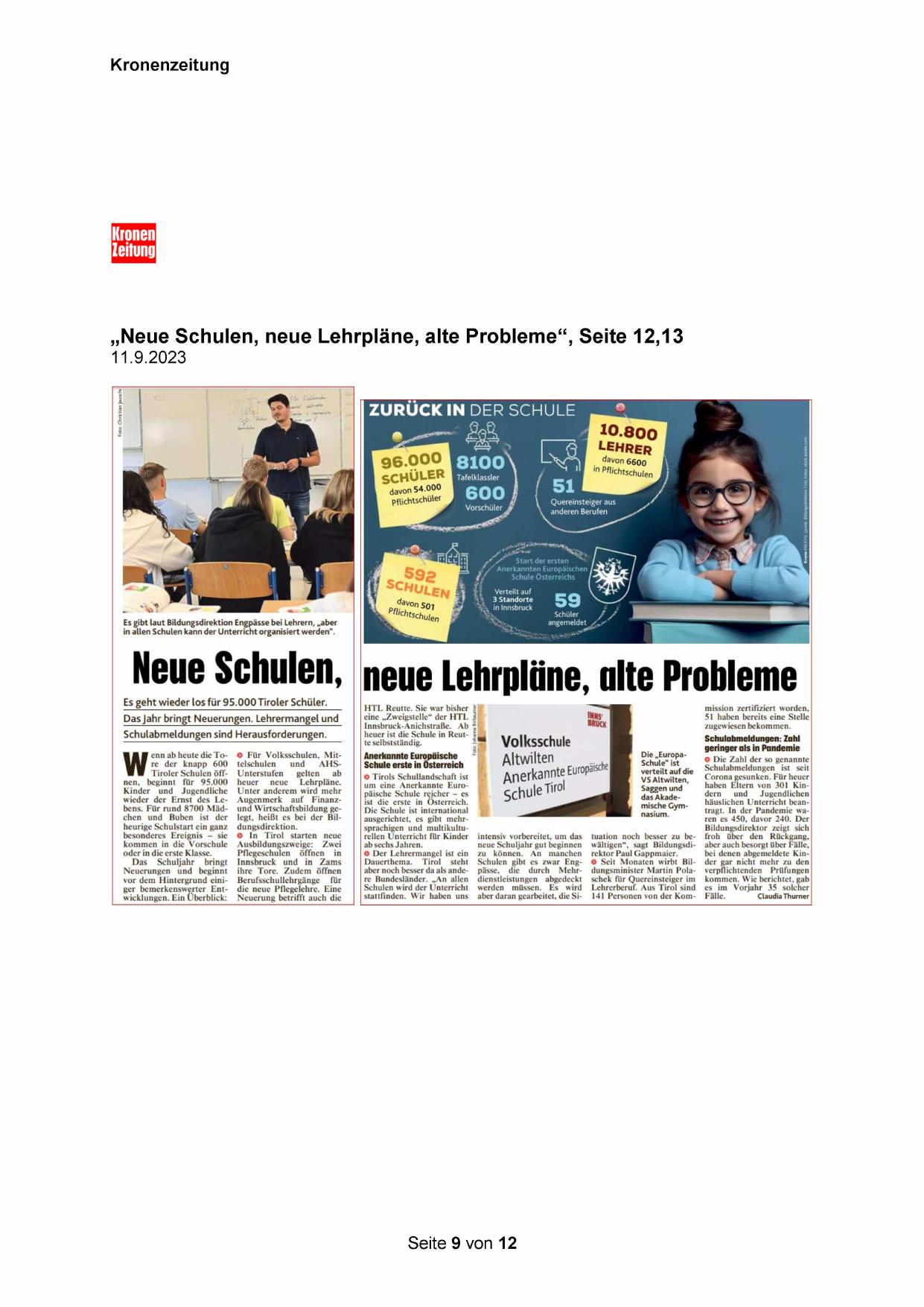 n D 00000 MEn a n ® Tirols Schullandschaft ist nerkann VSAltwilten. Corona gesunken. Für heuer