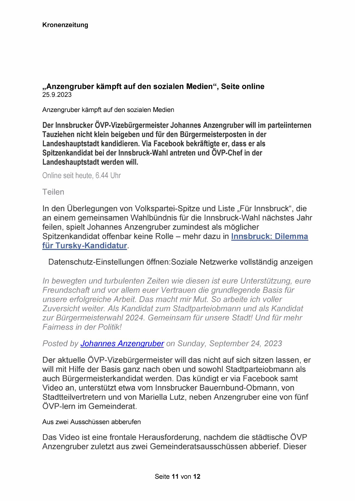 „Anzengruber kämpft auf den sozialen Medien“, Seite online