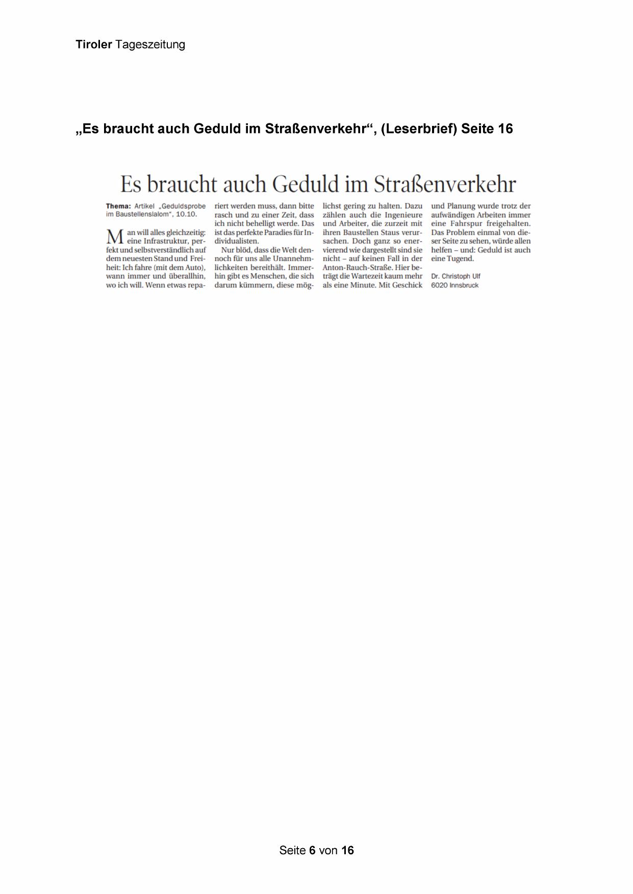 „Es braucht auch Geduld im Straßenverkehr“, (Leserbrief) Seite 16