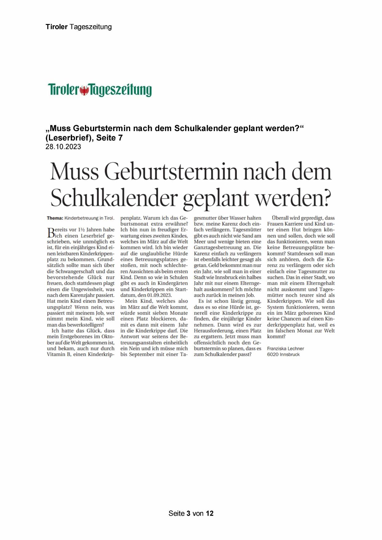 ist, für ein einjähriges Kind einen leistbaren Kinderkrippenplatz zu bekommen. Grundsätzlich sollte man sich über
