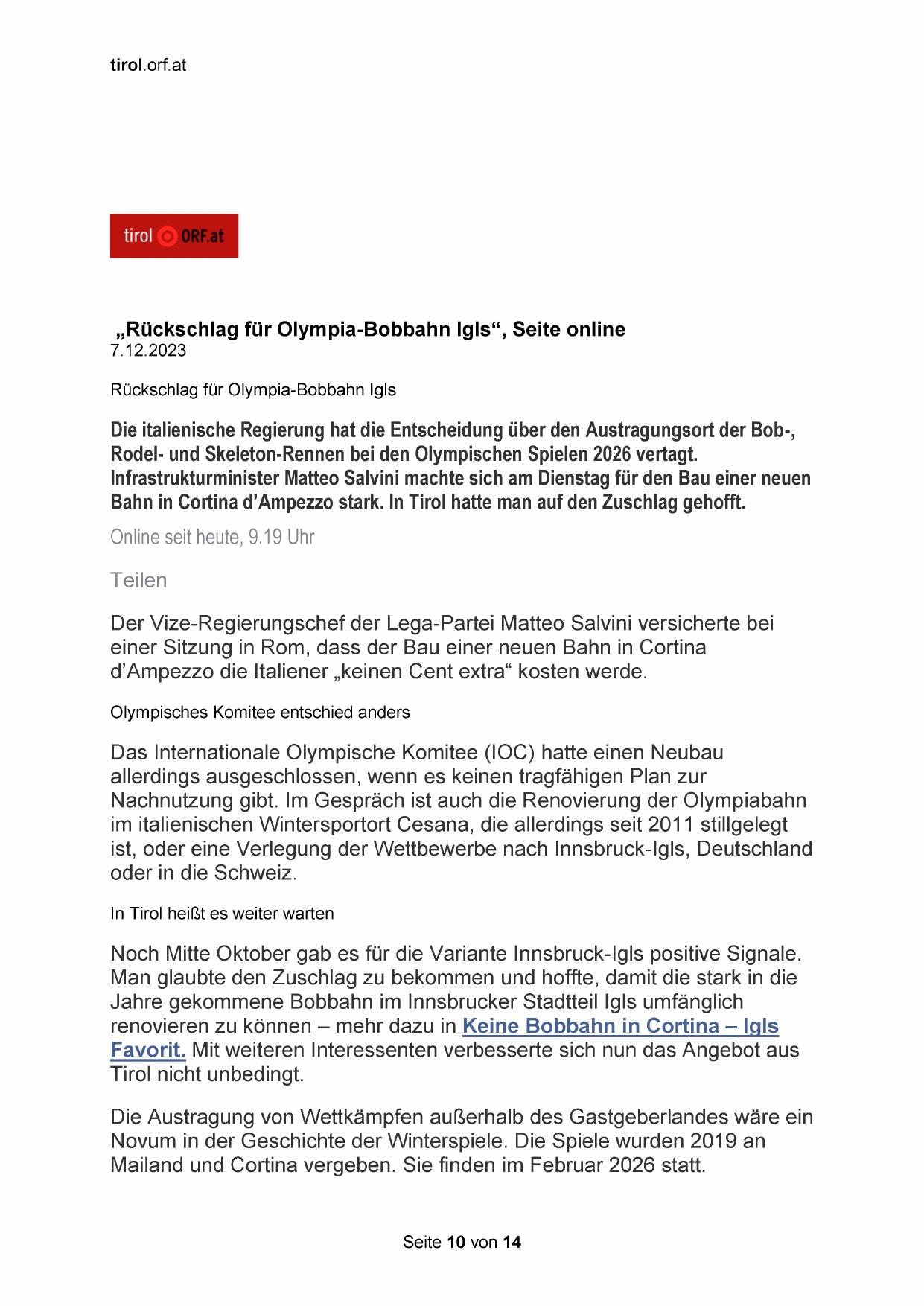 „Rückschlag für Olympia-Bobbahn Igls“, Seite online
