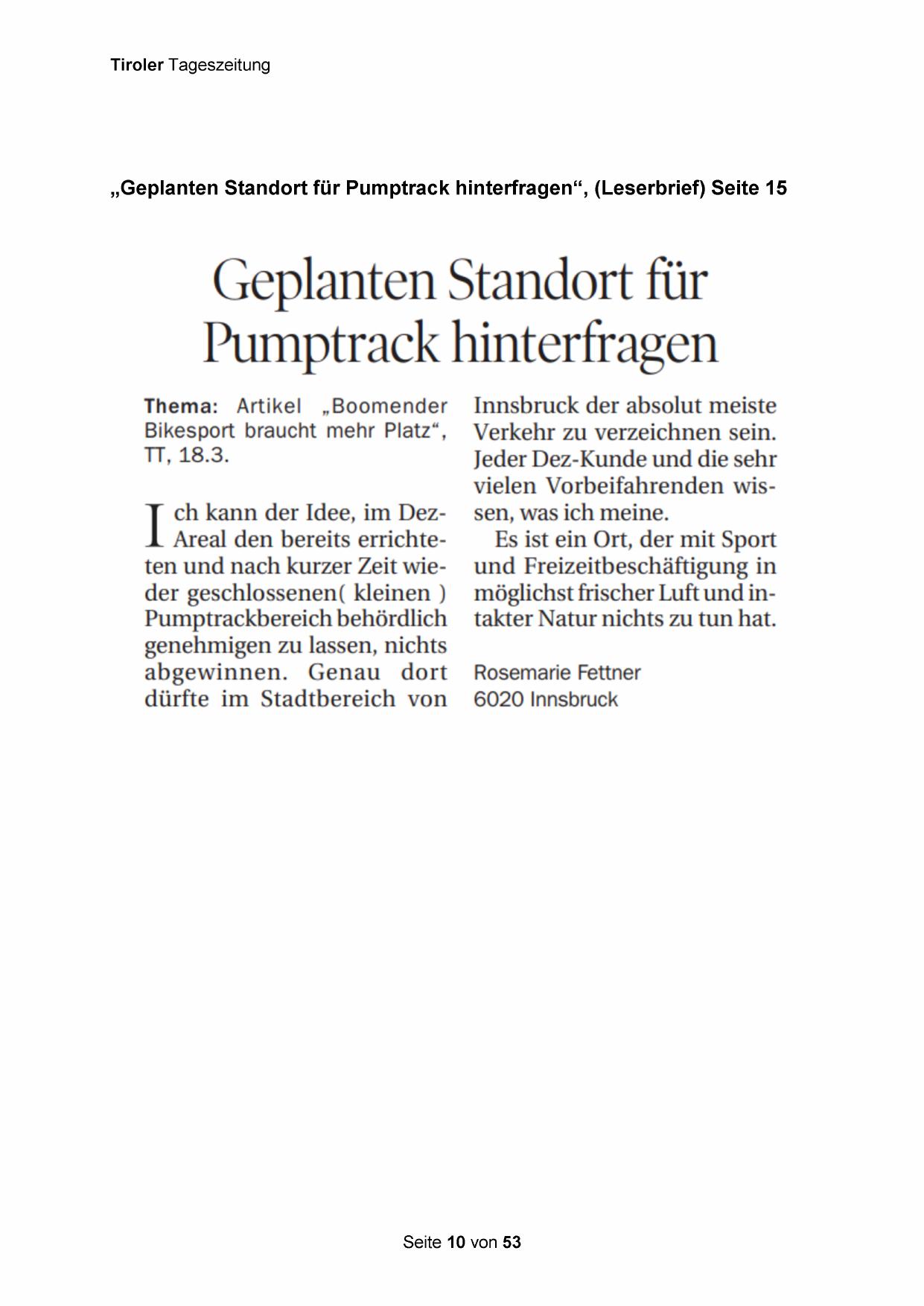 „Geplanten Standort für Pumptrack hinterfragen“, (Leserbrief) Seite 15