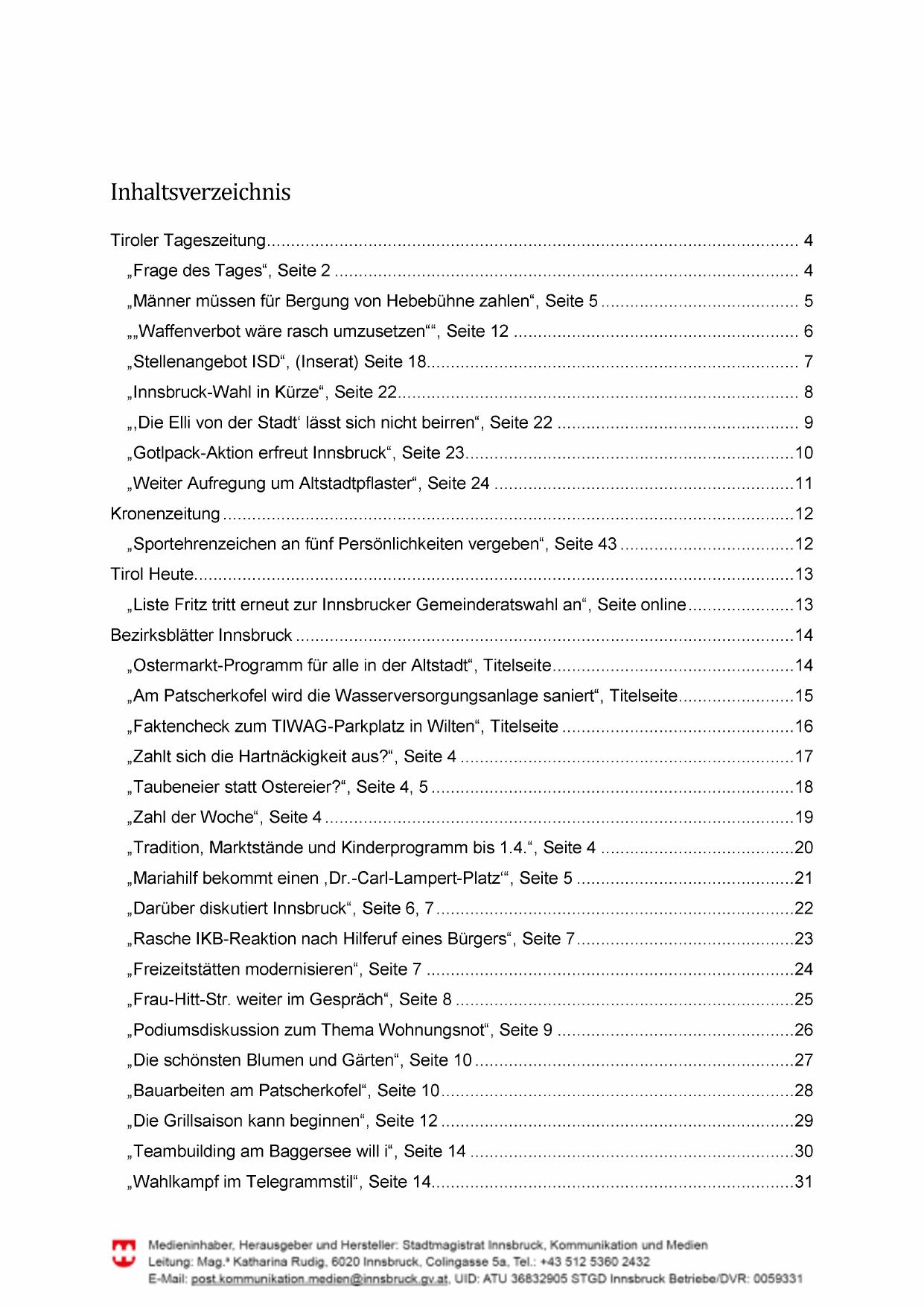 „Liste Fritz tritt erneut zur Innsbrucker Gemeinderatswahl an“, Seite online...................... 13