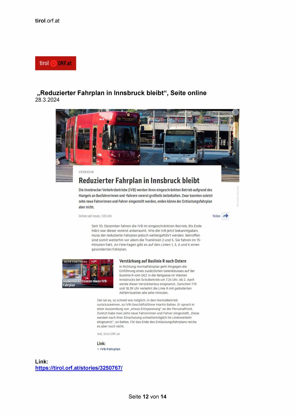 „Reduzierter Fahrplan in Innsbruck bleibt‘“, Seite online