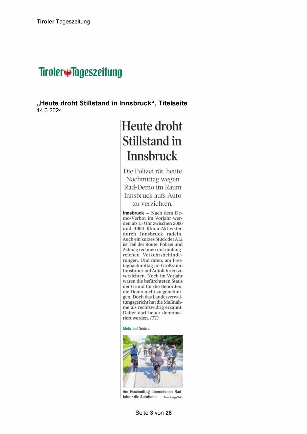 „Heute droht Stillstand in Innsbruck“, Titelseite