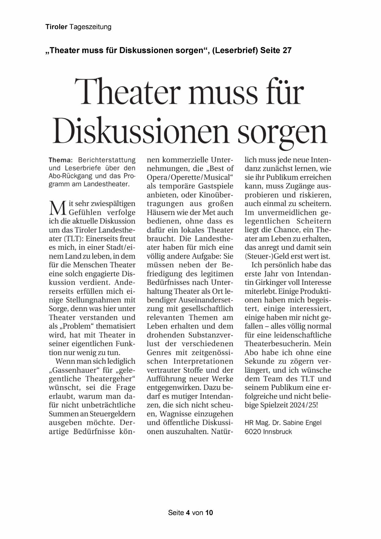 „Theater muss für Diskussionen sorgen“, (Leserbrief) Seite 27