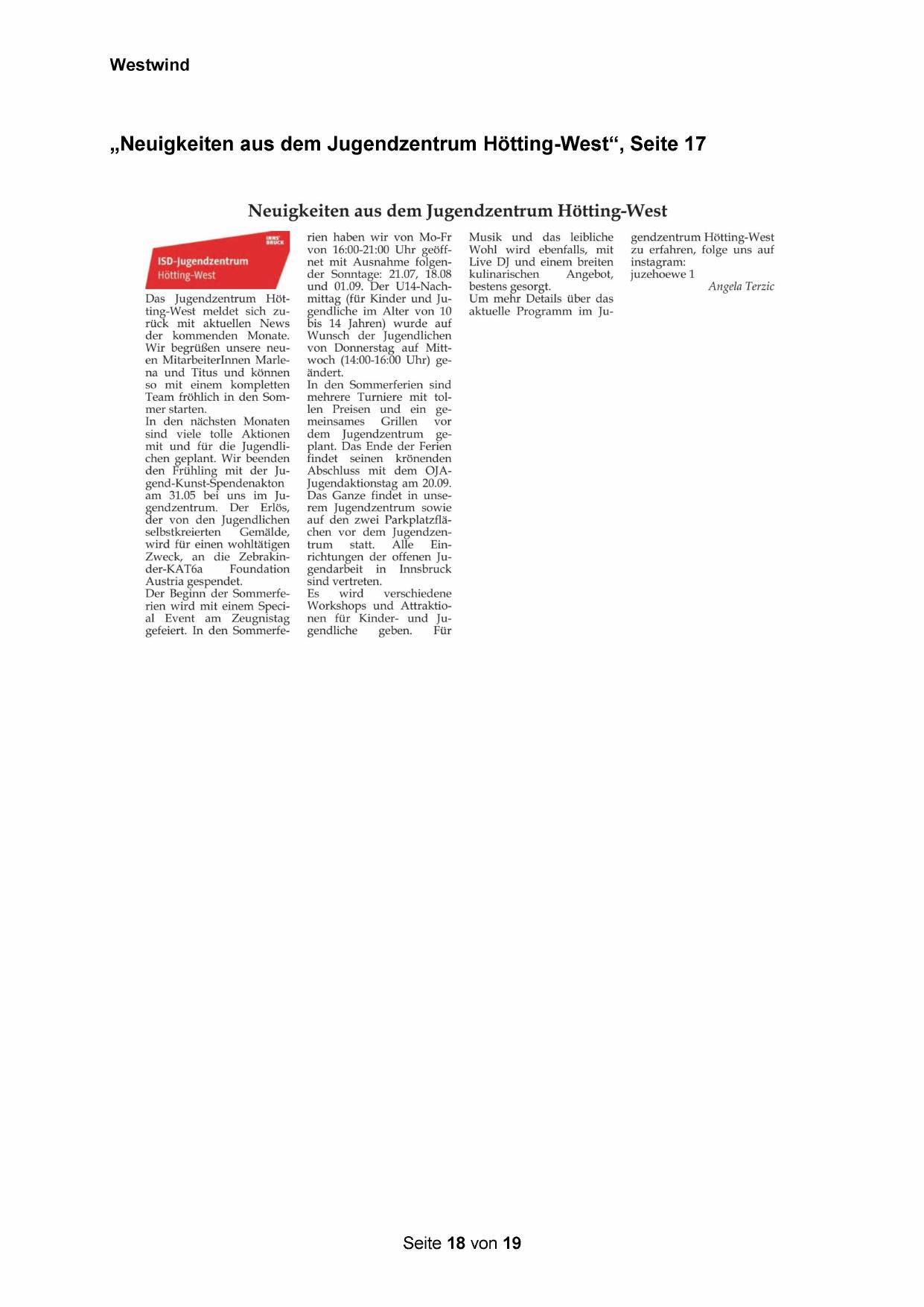 „Neuigkeiten aus dem Jugendzentrum Hötting-West“, Seite 17