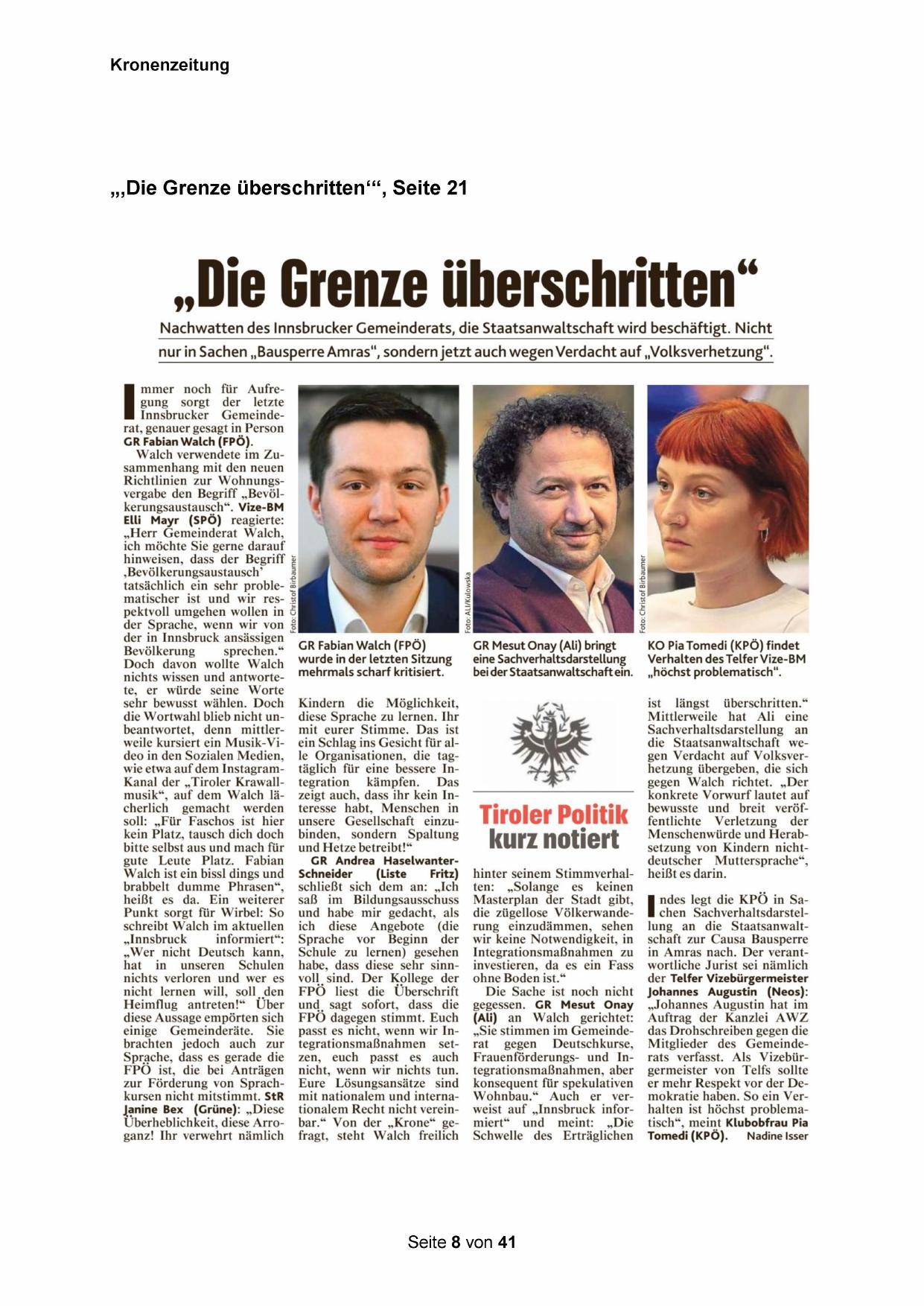 nur in Sachen „Bausperre Amras“, sondern jetzt auch wegen Verdacht auf „Volksverhetzung“.