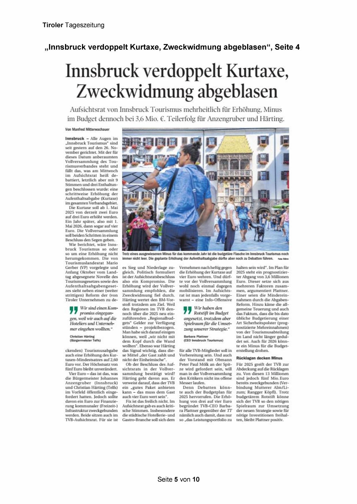 „Innsbruck verdoppelt Kurtaxe, Zweckwidmung abgeblasen“, Seite 4