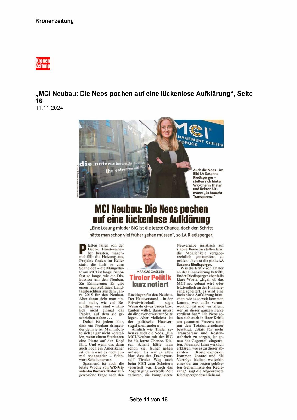 „MCI Neubau: Die Neos pochen auf eine lückenlose Aufklärung“, Seite