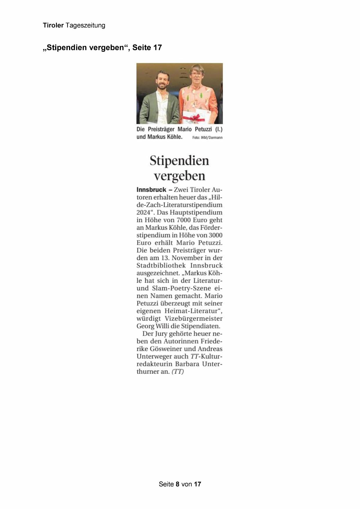 Innsbruck —- Zwei Tiroler Autoren erhalten heuer das „Hilde-Zach-Literaturstipendium