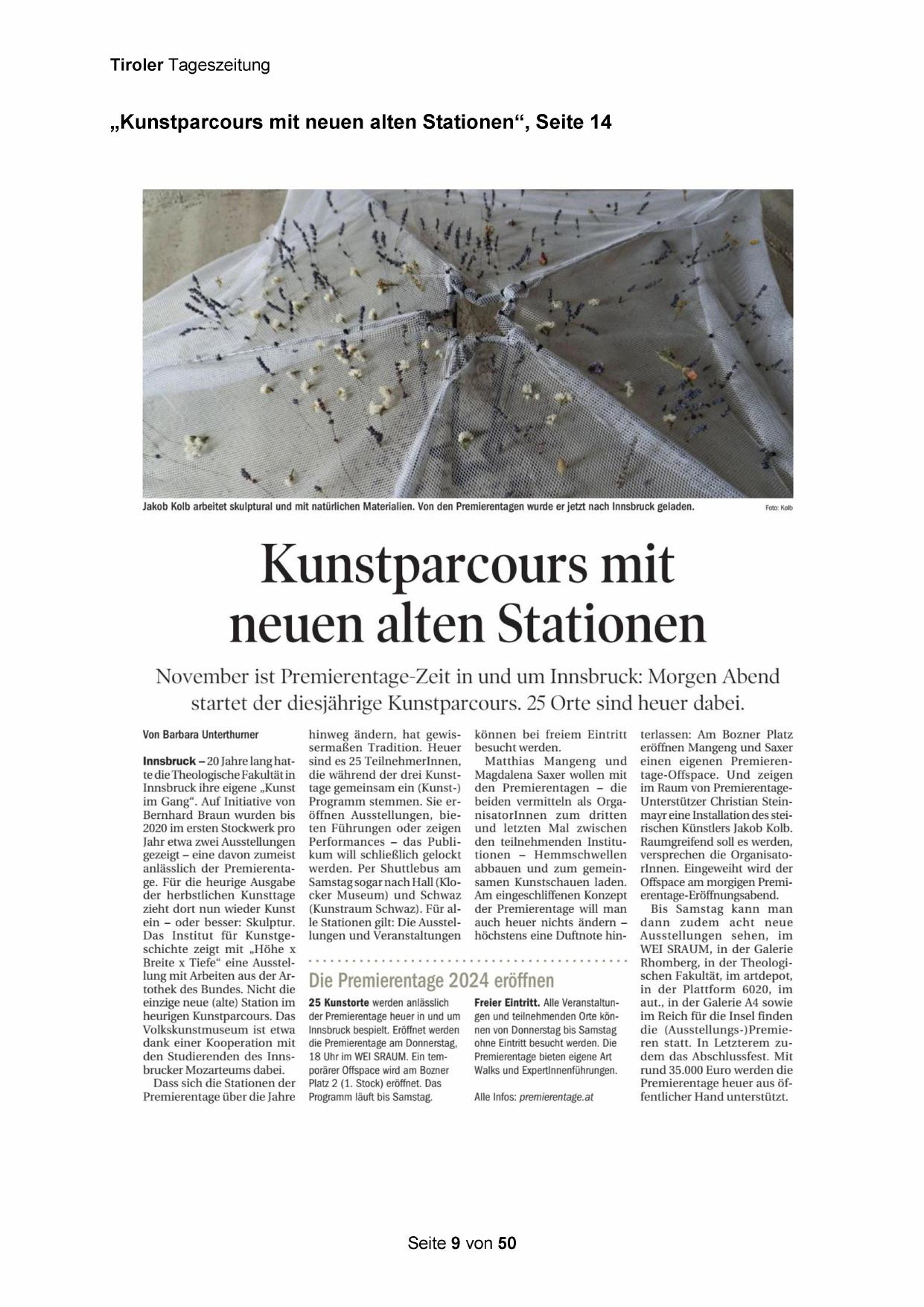 Jakob Kolb arbeitet skulptural und mit natürlichen Materialien. Von den Premierentagen wurde er jetzt nach Innsbruck geladen.
