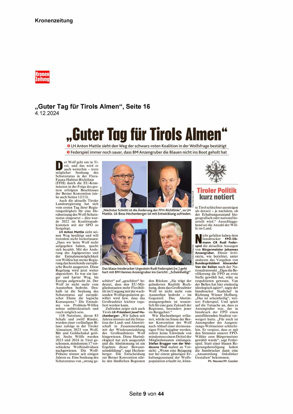 ® LH Anton Mattle sieht den Weg der schwarz-roten Koalition in der Wolfsfrage bestätigt