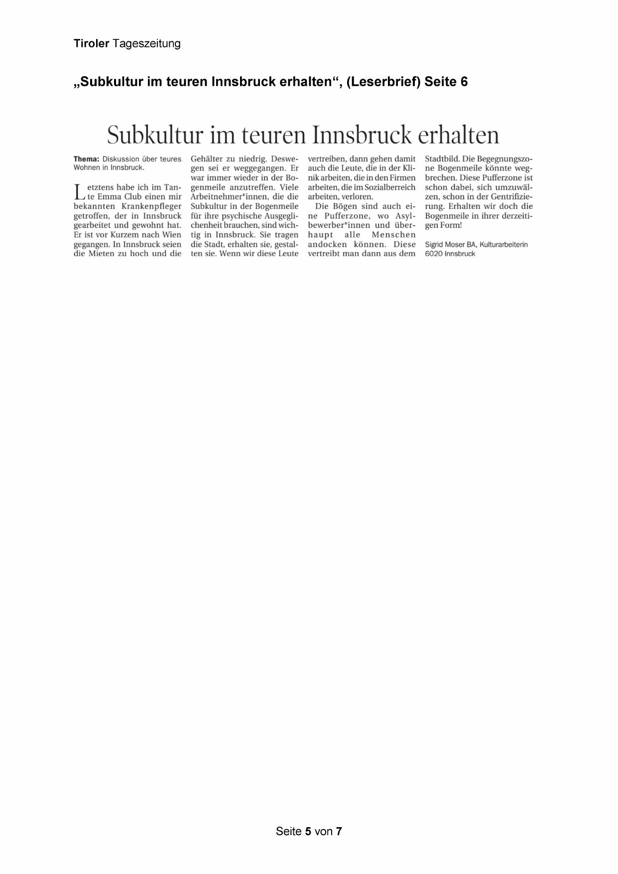 „Subkultur im teuren Innsbruck erhalten“, (Leserbrief) Seite 6