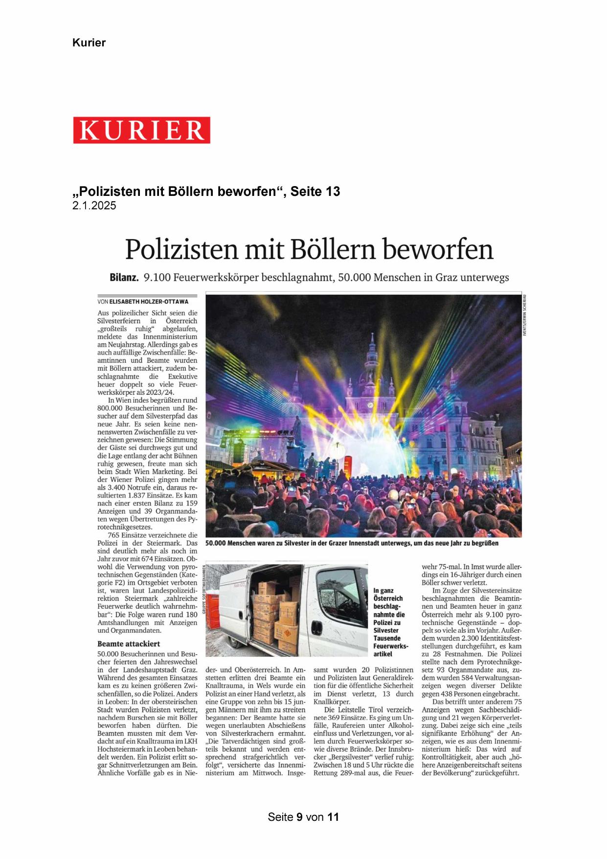 Osterreich mehr als 9.100 pyrotechnische Gegenstände — doppelt so viele als im Vorjahr. Außerdem wurden 2.300 Identitätsfeststellungen durchgeführt, es kam