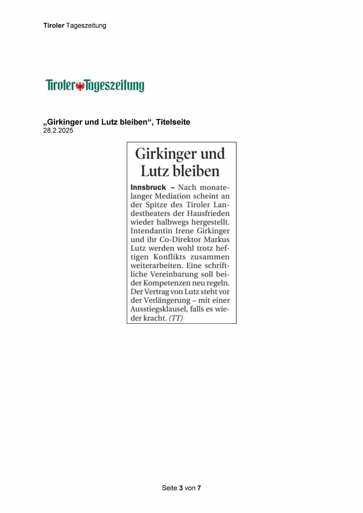 der Spitze des Tiroler Landestheaters der Hausfrieden