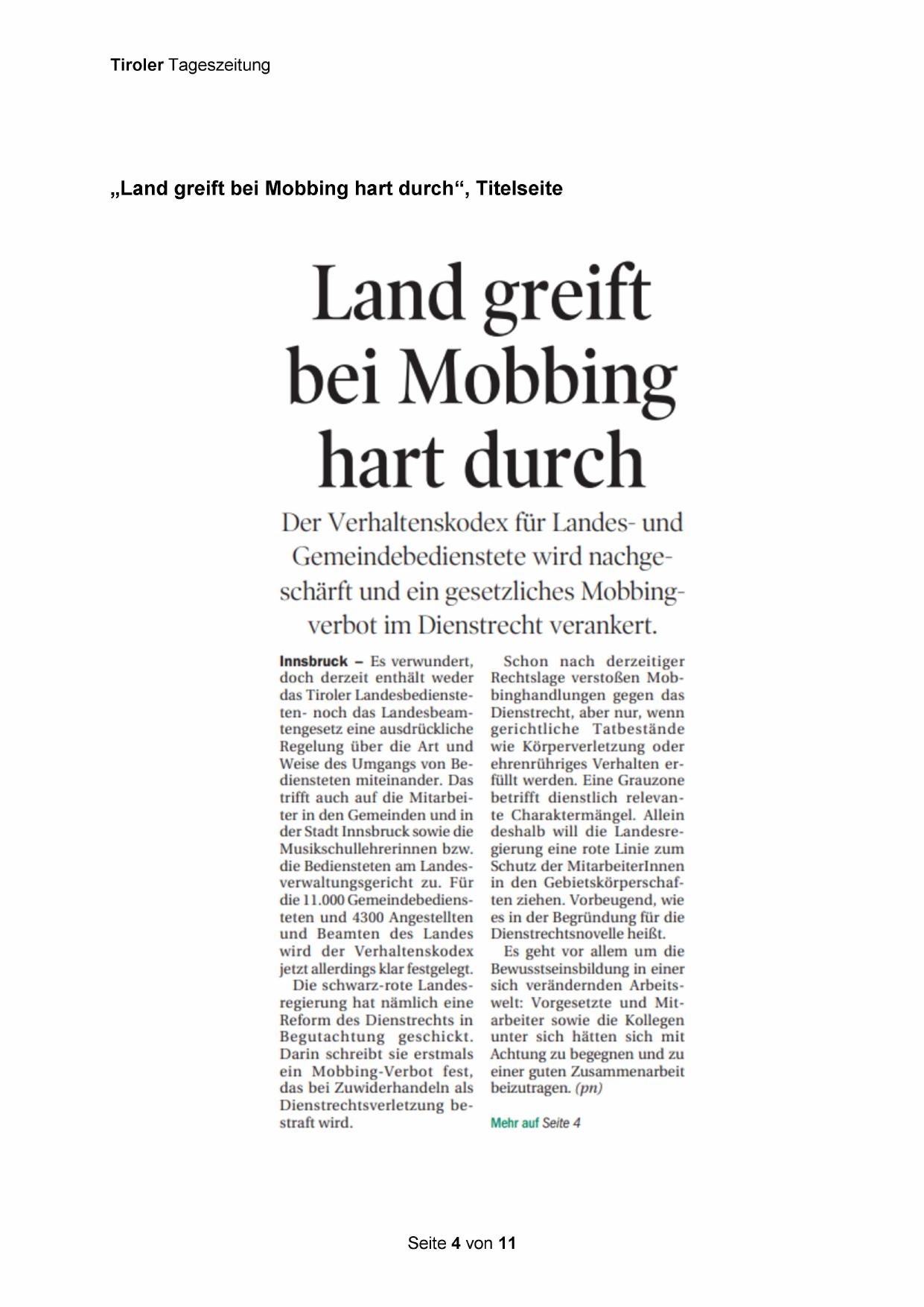 Gemeindebedienstete wird nachgeschärft und ein gesetzliches Mobbingverbot im Dienstrecht verankert.