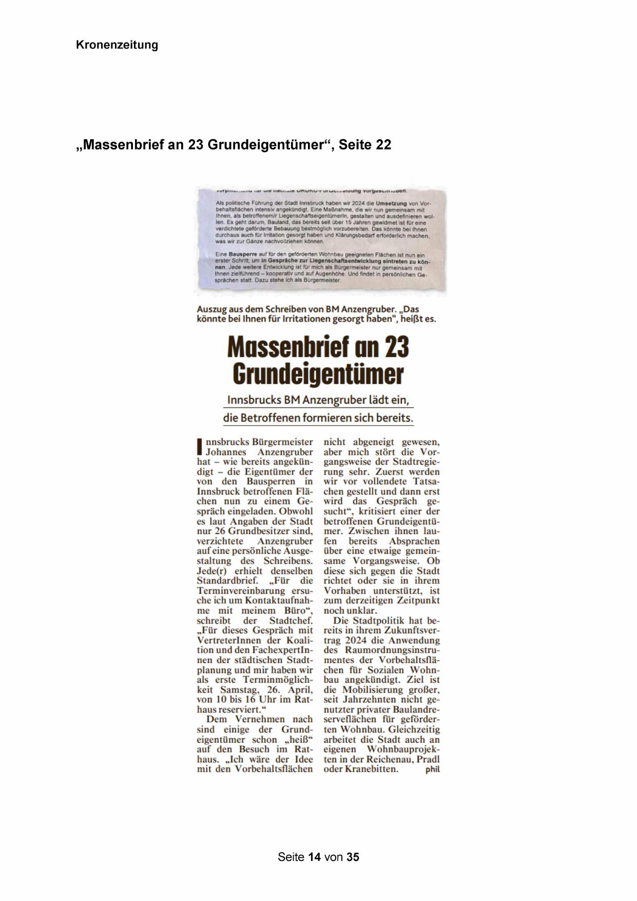 Auszug aus dem Schreiben von BM Anzengruber. „Das