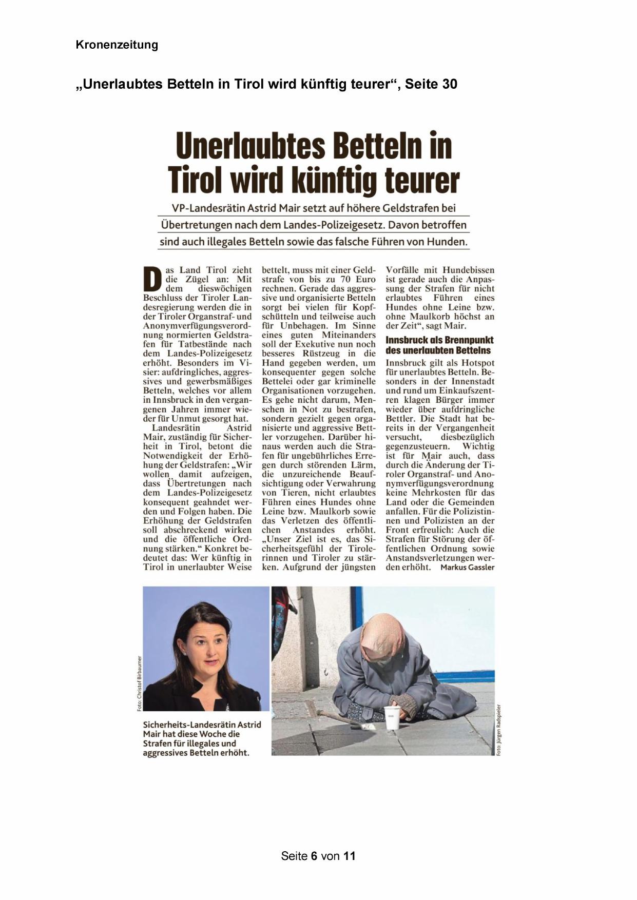 „Unerlaubtes Betteln in Tirol wird künftig teurer“, Seite 30