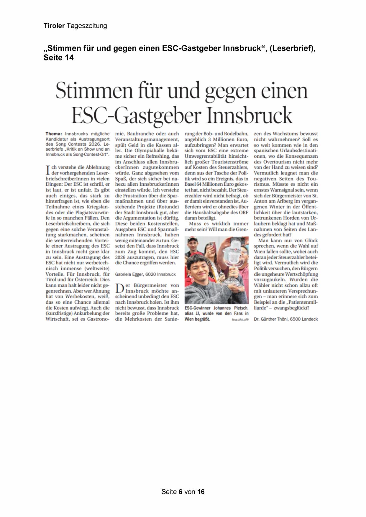 „Stimmen für und gegen einen ESC-Gastgeber Innsbruck“, (Leserbrief),