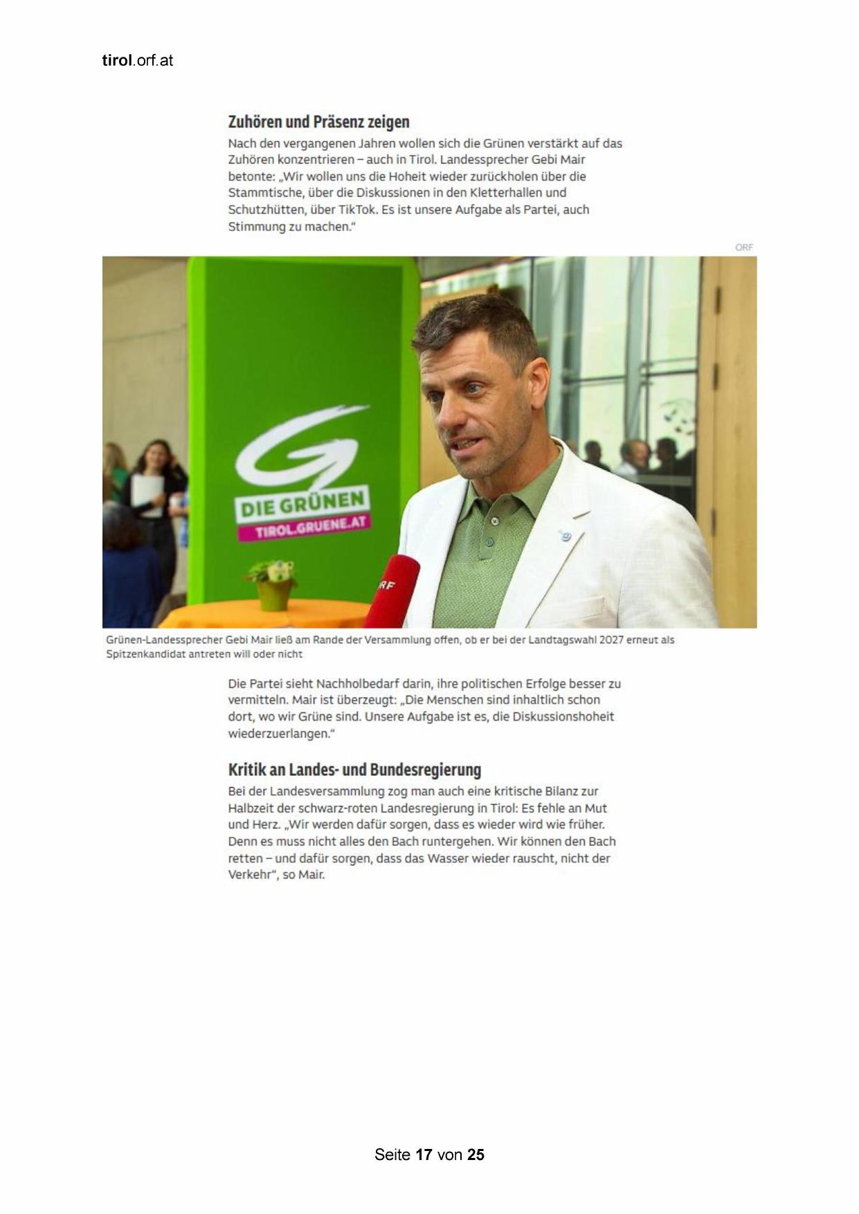 Grünen-Landessprecher Gebi Mair ließ am Rande der Versammlung offen, ob er bei der Landtagswahl 2027 erneut als