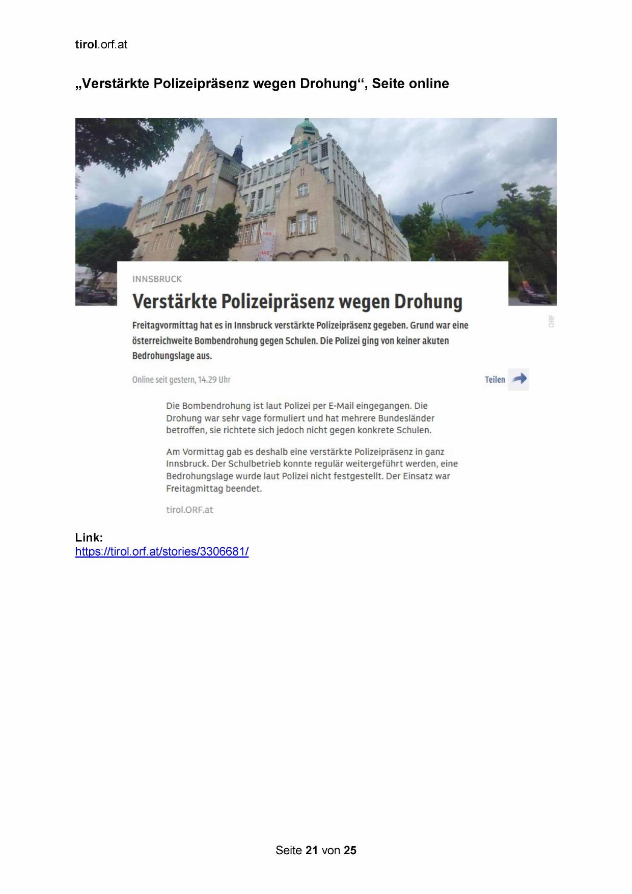 „Verstärkte Polizeipräsenz wegen Drohung“, Seite online