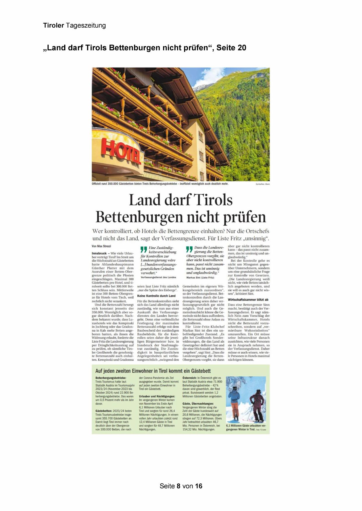 zu prüfen, ob sämtliche Tiroler Großhotels die genehmigte Bettenanzahl auch einhalten. Kempinski und Gradonna