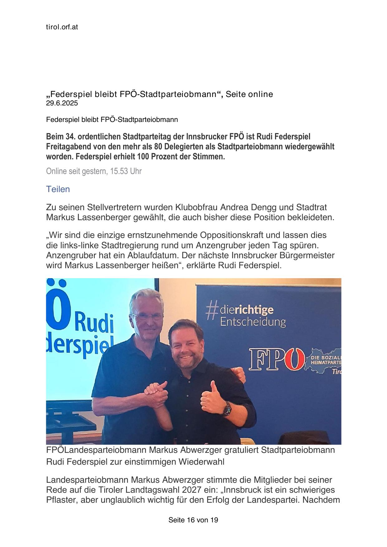 „Federspiel bleibt FPÖ-Stadtparteiobmann“, Seite online