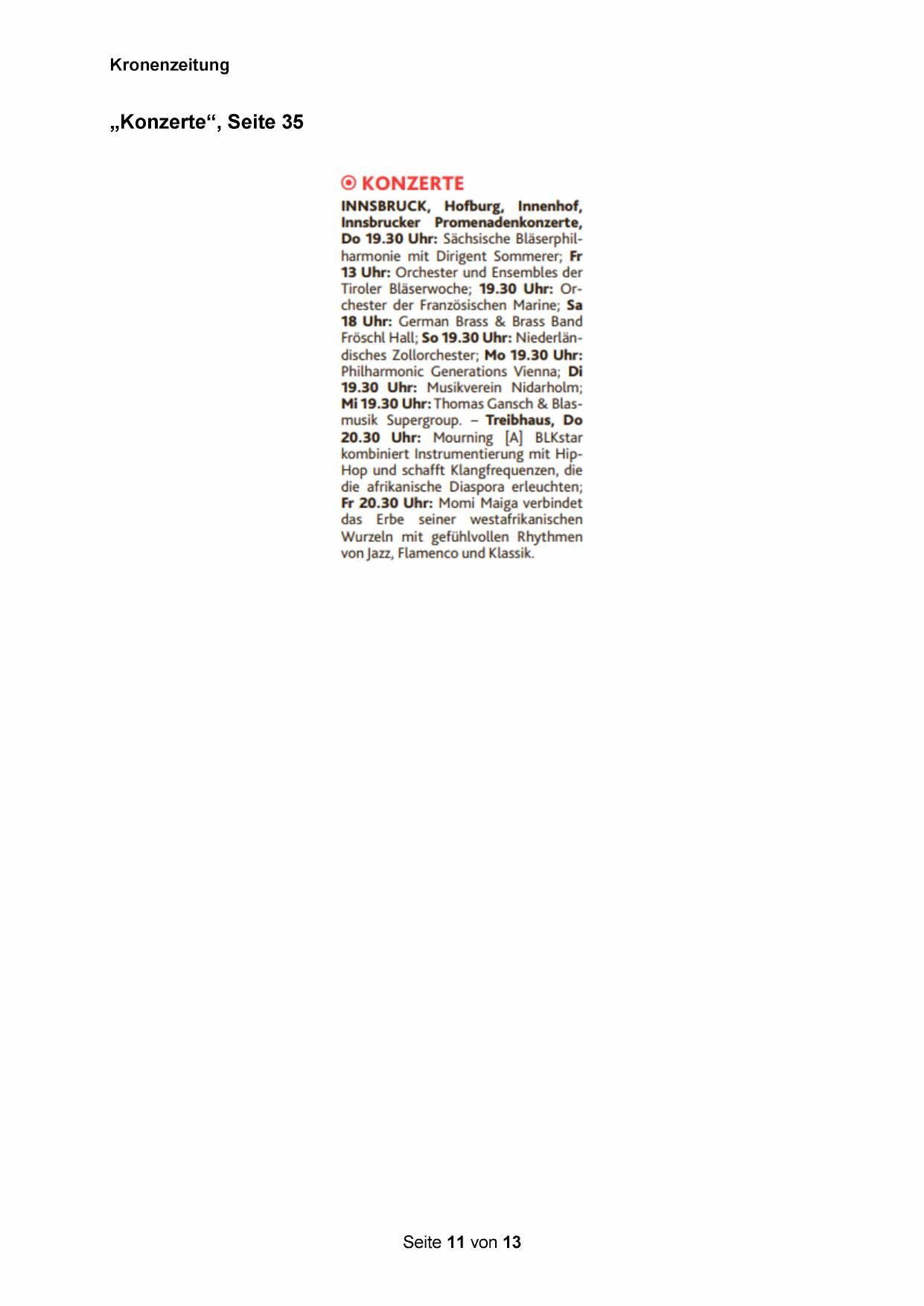 Tiroler Bläserwoche; 19.30 Uhr: Orchester der Französischen Marine; Sa