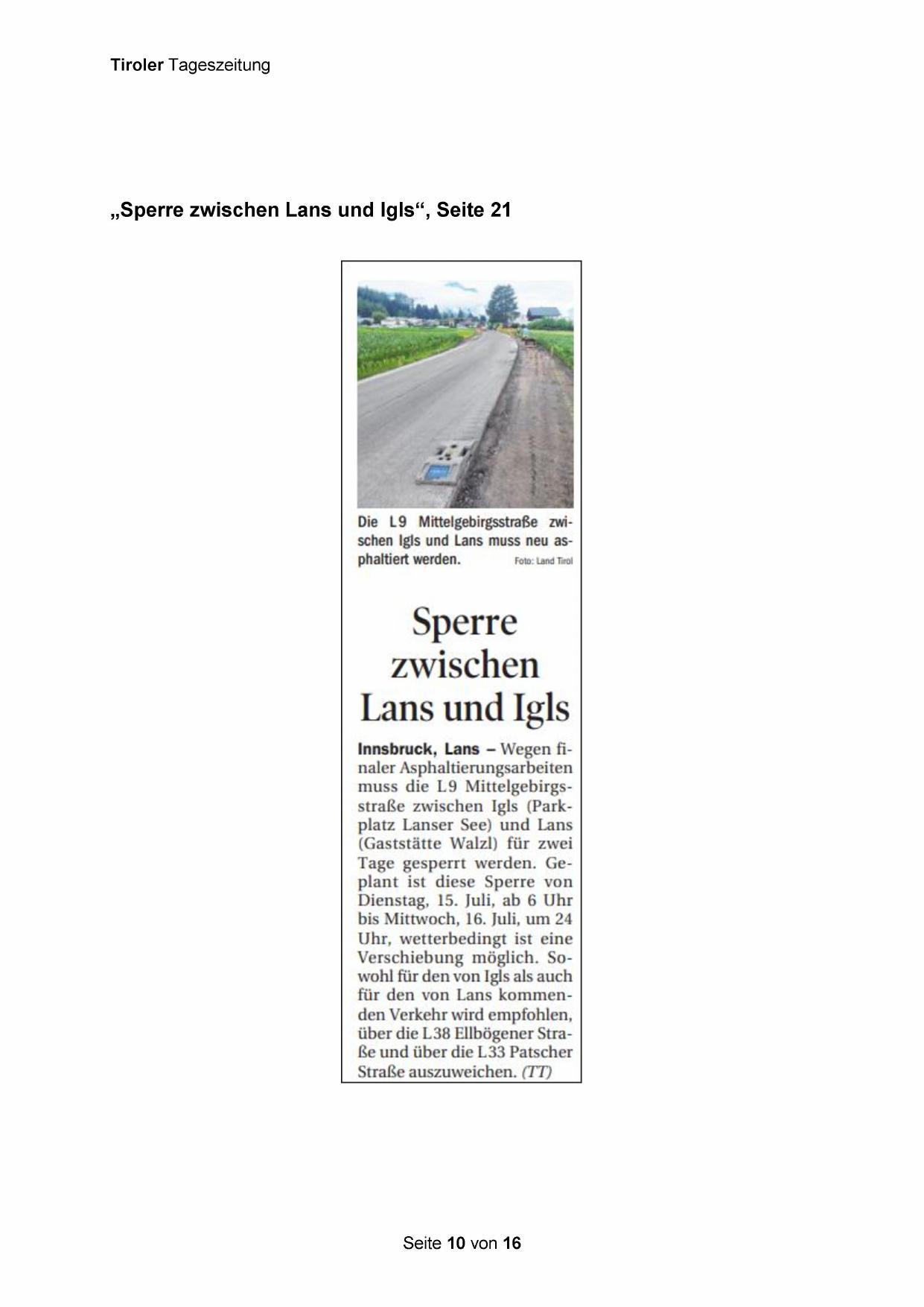 muss die L9 Mittelgebirgsstraße zwischen Igls (Parkplatz Lanser See) und Lans