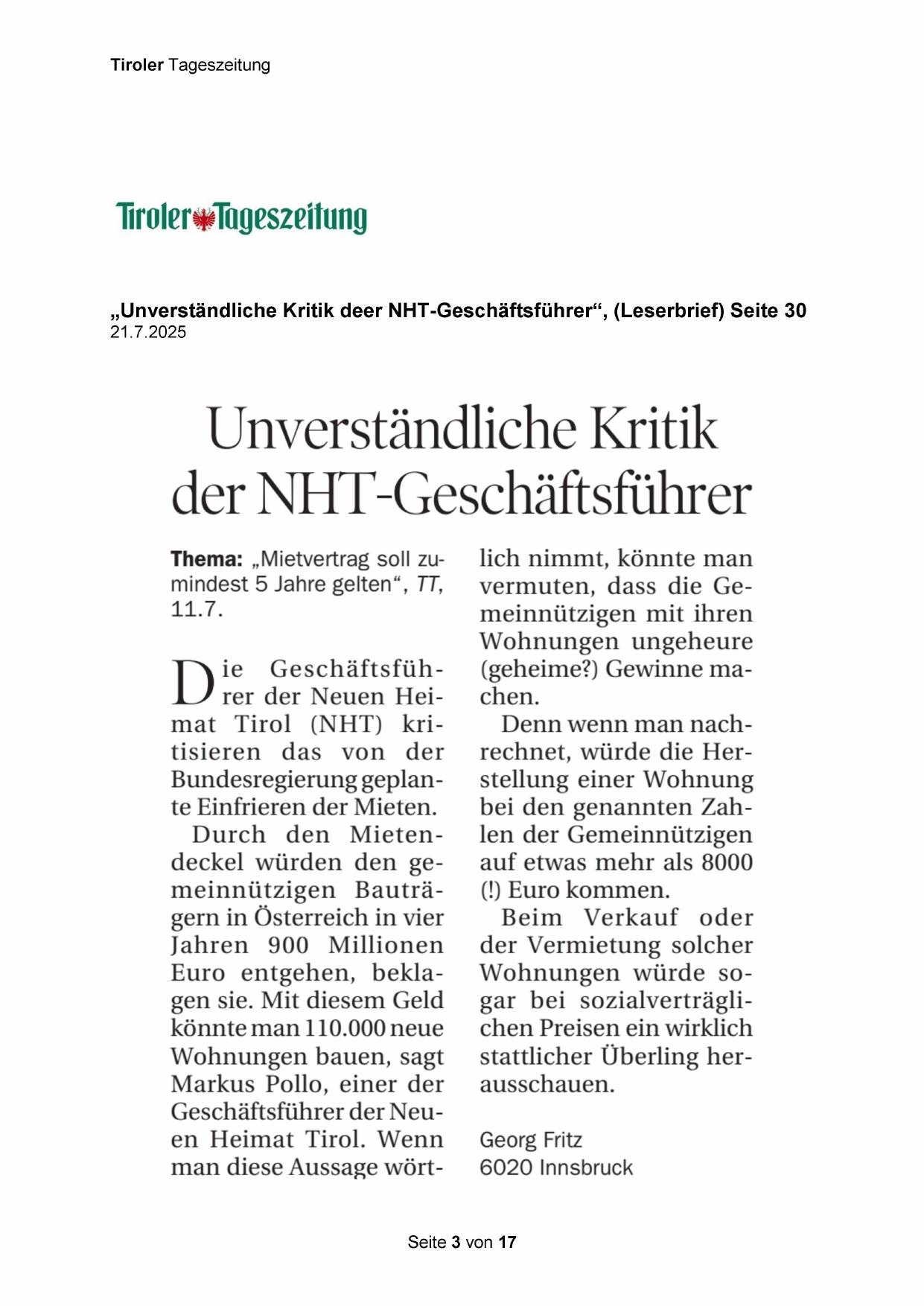 D je Geschäftsführer der Neuen Heimat Tirol (NHT) kritisieren das von der