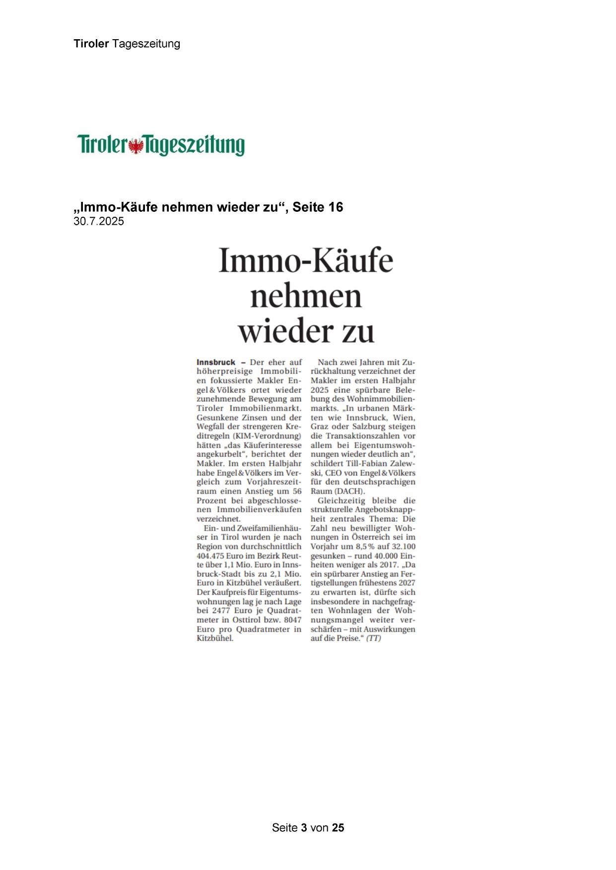 2025 eine spürbare Belebung des Wohnimmobilienmarkts. „In urbanen Märkten wie Innsbruck, Wien,